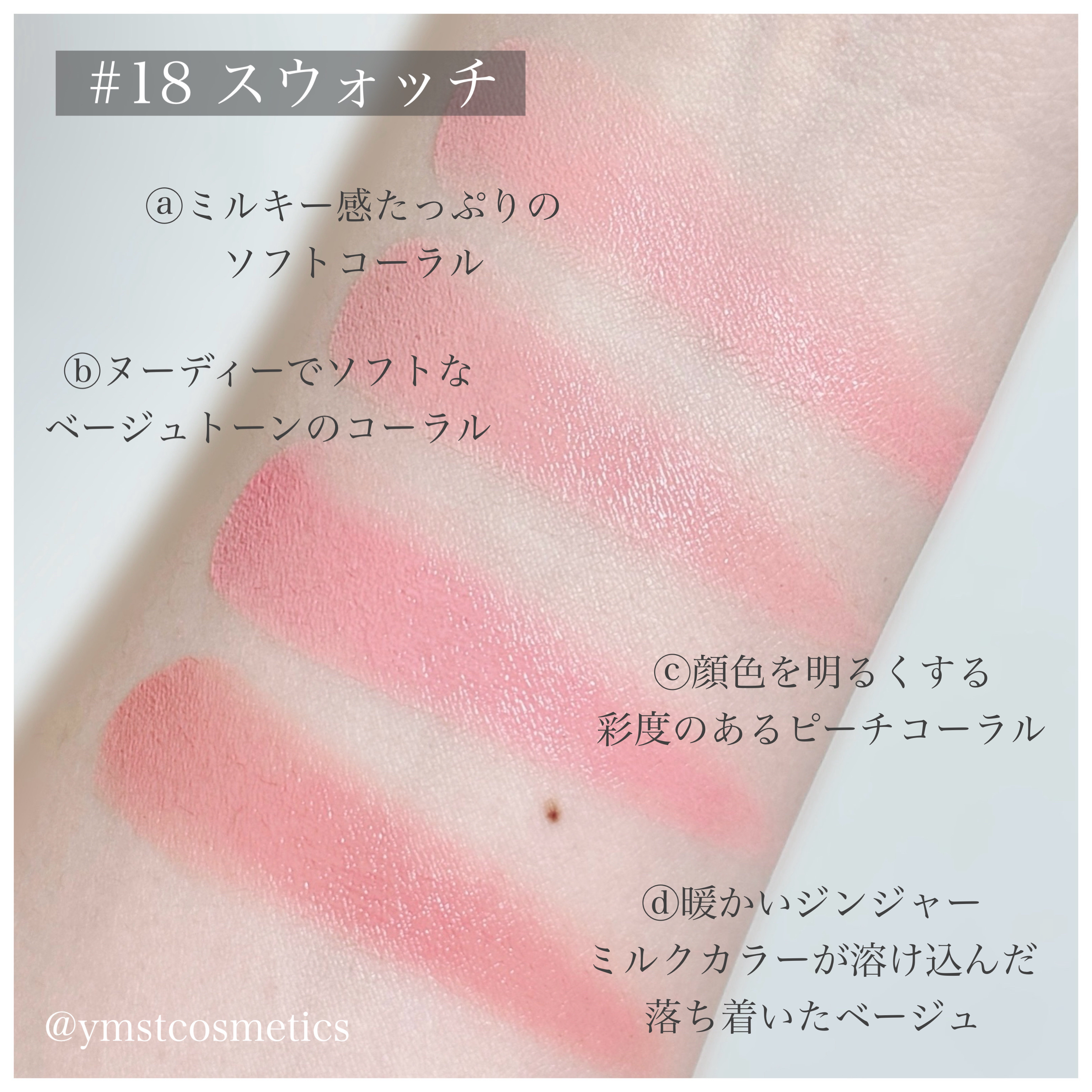 - <03 ピーチブレンディング> タルク、マイカ、酸化チタン、ポリメタクリル酸メチル、ラウロイルリシン、ジメチコン、黄5、ステアロイルオキシステアリン酸オクチルドデシル、リンゴ酸ジイソステアリル、水添野菜油、ミリスチン酸イソセチル、カプリリルグリコール、カプリル酸グリセリル、酸化鉄、エチルヘキシルグリセリン、トリエトキシカプリリルシラン、水添レシチン、黄4、合成フルオロフロゴパイト、赤226、赤201、水、水添ポリイソブテン、塩化Na、硫酸Na、パルミチン酸、トコフェロール <04 ベージュニット> タルク、マイカ、酸化チタン、ポリメタクリル酸メチル、酸化鉄、ラウロイルリシン、ジメチコン、ステアロイルオキシステアリン酸オクチルドデシル、リンゴ酸ジイソステアリル、水添野菜油、ミリスチン酸イソセチル、カプリリルグリコール、カプリル酸グリセリル、エチルヘキシルグリセリン、水添レシチン、トリエトキシカプリリルシラン、赤201、赤226、水、トコフェロール、塩化Na、硫酸Na <05 バイオレットニット> タルク、マイカ、酸化チタン、ポリメタクリル酸メチル、ラウロイルリシン、ジメチコン、ステアロイルオキシステアリン酸オクチルドデシル、リンゴ酸ジイソステアリル、赤202、酸化鉄、ミリスチン酸イソセチル、カプリリルグリコール、水添パーム油、水添アブラナ種子油、グンジョウ、カプリル酸グリセリル、エチルヘキシルグリセリン、水添レシチン、トリエトキシカプリリルシラン、トコフェロール <06 ベリースムージー> タルク、マイカ、酸化チタン、ポリメタクリル酸メチル、リンゴ酸ジイソステアリル、ステアロイルオキシステアリン酸オクチルドデシル、ジメチコン、ミリスチン酸イソセチル、ミリスチン酸Mg、1,2-ヘキサンジオール、カプリル酸グリセリル、ステアリルジメチコン、水添レシチン、赤202、水酸化AI、グンジョウ、赤226、黄4、酸化鉄、カオリン、トリエトキシカプリリルシラン <07 キャンディーベリー> タルク、マイカ、酸化チタン、ポリメタクリル酸メチル、ラウロイルリシン、ジメチコン、ステアロイルオキシステアリン酸オクチルドデシル、リンゴ酸ジイソステアリル、黄4、ミリスチン酸イソセチル、カプリリルグリコール、赤226、カプリル酸グリセリル、エチルヘキシルグリセリン、トリエトキシカプリリルシラン、水添レシチン、赤202、酸化鉄、水、塩化Na、硫酸Na、トコフェロール <08 ブルーベリーソルベ> タルク、酸化チタン、マイカ、ポリメタクリル酸メチル、ラウロイルリシン、ステアロイルオキシステアリン酸オクチルドデシル、ジメチコン、リンゴ酸ジイソステアリル、ミリスチン酸イソセチル、赤202、カプリリルグリコール、カプリル酸グリセリル、トリエトキシカプリリルシラン、エチルヘキシルグリセリン、黄4、水添レシチン、赤226、酸化鉄、グンジョウ、水、塩化N a、硫酸Na、トコフェロール <09 アーモンドバニラ> タルク、酸化チタン、マイカ、ポリメタクリル酸メチル、ラウロイルリシン、ジメチコン、ステアロイルオキシステアリン酸オクチルドデシル、リンゴ酸ジイソステアリル、酸化鉄、ミリスチン酸イソセチル、カプリリルグリコール、黄4、カプリル酸グリセリル、赤202、トリエトキシカプリリルシラン、エチルヘキシルグリセリン、グンジョウ、水添レシチン、ミリスチン酸Mg、赤226、水、塩化Na、硫酸Na、トコフェロール <10 ミューテッドナッツ> タルク、マイカ、シリカ、窒化ホウ素、ミリスチン酸Mg、ラウリン酸ヘキシル、ジメチコン、トリ(カプリル酸/カプリン酸)グリセリル、メチルプロパンジオール、フェニルトリメ チコン、酸化チタン、炭酸Ca、プロパンジオール、酸化鉄、ヘキサ(ヒドロキシステアリン酸/ステアリン酸/ロジン酸)ジペンタエリスリチル、グンジョウ、トリエトキシカプリリルシラン、メチコン、赤226、ラウロイルリシン、黄4、水酸化AI <11 クリームソーダ> タルク、マイカ、酸化チタン、ポリメタクリル酸メチル、ラウロイルリシン、ステアロイルオキシステアリン酸オクチルドデシル、リンゴ酸ジイソステアリル、ジメチコン、ミリスチン酸イソセチル、カプリリルグリコール、グンジョウ、カプリル酸グリセリル、エチルヘキシルグリセリン、水酸化AI、水添レシチン、トリエトキシカプリリルシラン、ミリスチン酸Mg、赤226、酸化鉄、水、塩化Na、硫酸Na、トコフェロール <12 ゴールデンフラワー> タルク、マイカ、酸化チタン、ポリメタクリル酸メチル、ラウロイルリシン、ステアロイルオキシステアリン酸オクチルドデシル、ジメチコン、リンゴ酸ジイソステアリル、酸化鉄、ミリスチン酸イソセチル、黄5、カプリリルグリコール、カプリル酸グリセリル、ミリスチン酸Mg、黄4、エチルヘキシルグリセリン、トリエトキシカプリリルシラン、赤226、水添レシチン、水酸化AI、水、硫酸Na、塩化Na、トコフェロール <13 スウィートハート> タルク、マイカ、酸化チタン、ポリメタクリル酸メ