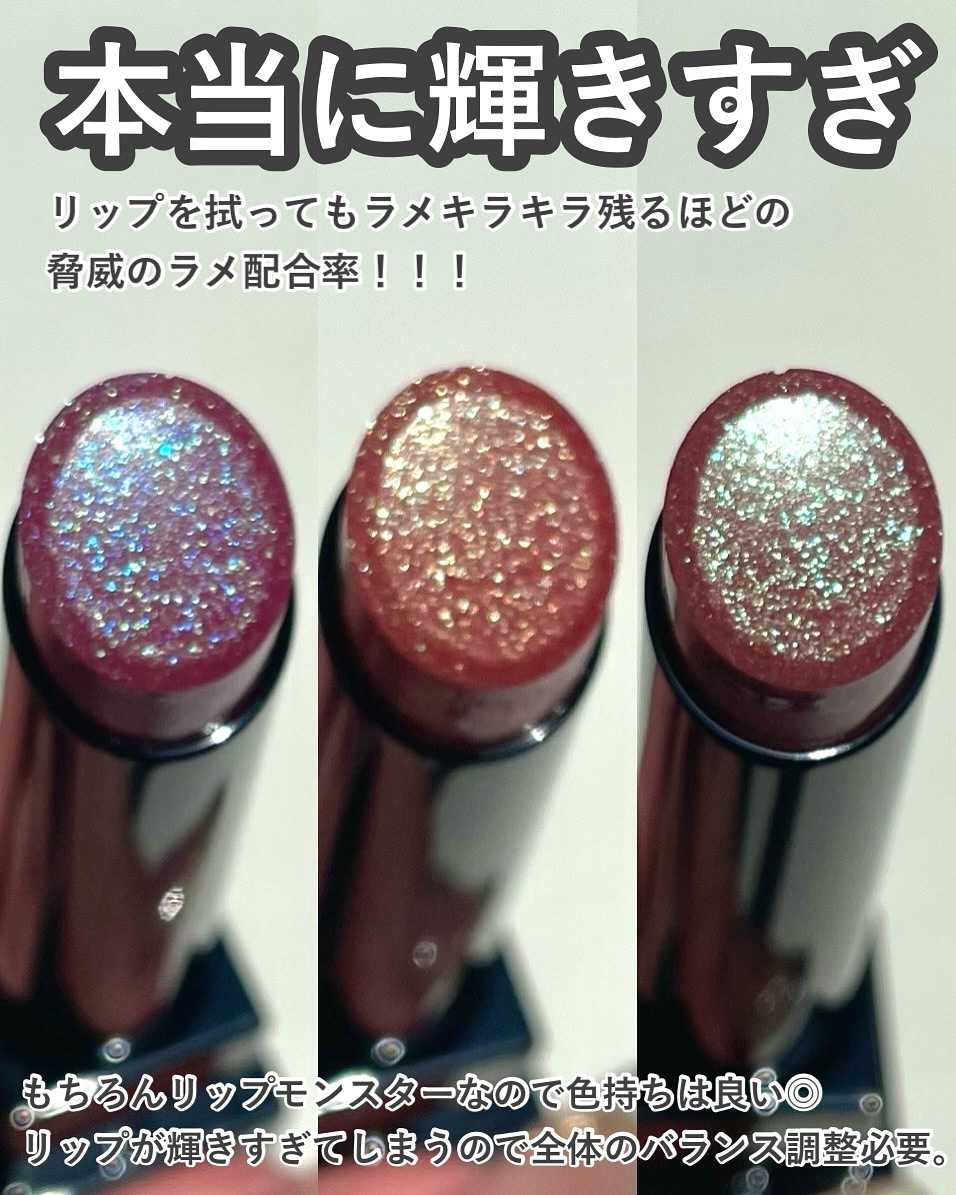らめえくすぎて罪⚡️この夏限定のリップモンスターはラメの配合量が半端なーい!!!どこからどう見ても360°ラメ、ラメ、ラメえええ!!各カラーさっくり紹介。・EX-6ロケット花火流星群ブルベにぴったりピンクパープル系カラーに緑・青ラメザクザク!...