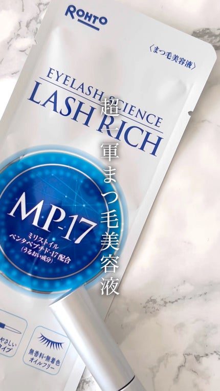 まつ毛の成長期に働きかける機能性ペプチド ロート製薬独自開発成分※(MP-17(ミリストイルペンタペプチド(うるおい成分)))を配合しているよ🫢 8種類※(ミリストイルペンタペプチド-17、ガゴメエキス(フコダイン)、オクタネニンジン根エキス、パンテノール、アルギニン、グリセリン、グリチルリチン酸アンモニウム(うるおい成分))美容成分を含んでいる、目の衛生を考慮して1ヶ月使い切りサイズになっているよ🙆🏻♀️ サラサラとしたテクスチャーで筆が細いから塗りやすかった✨️