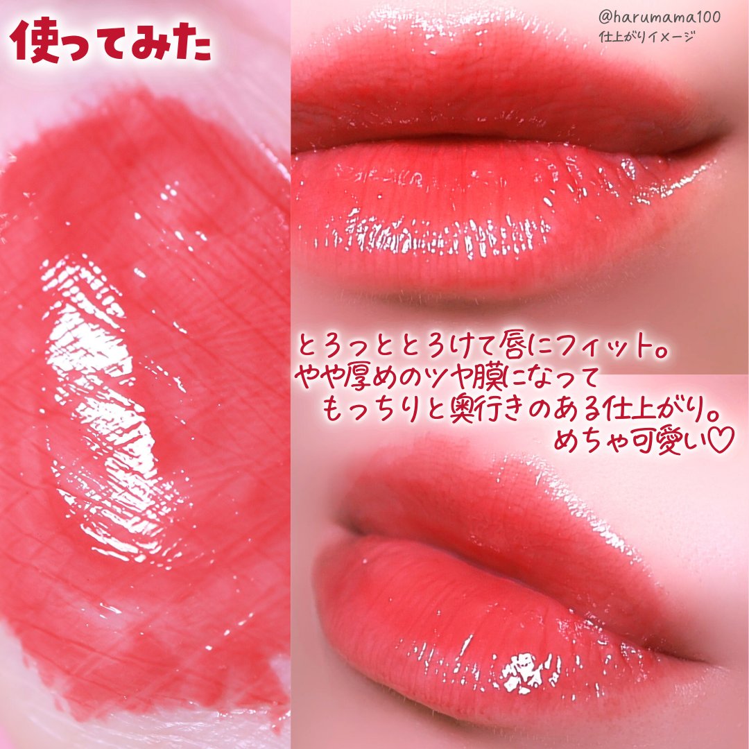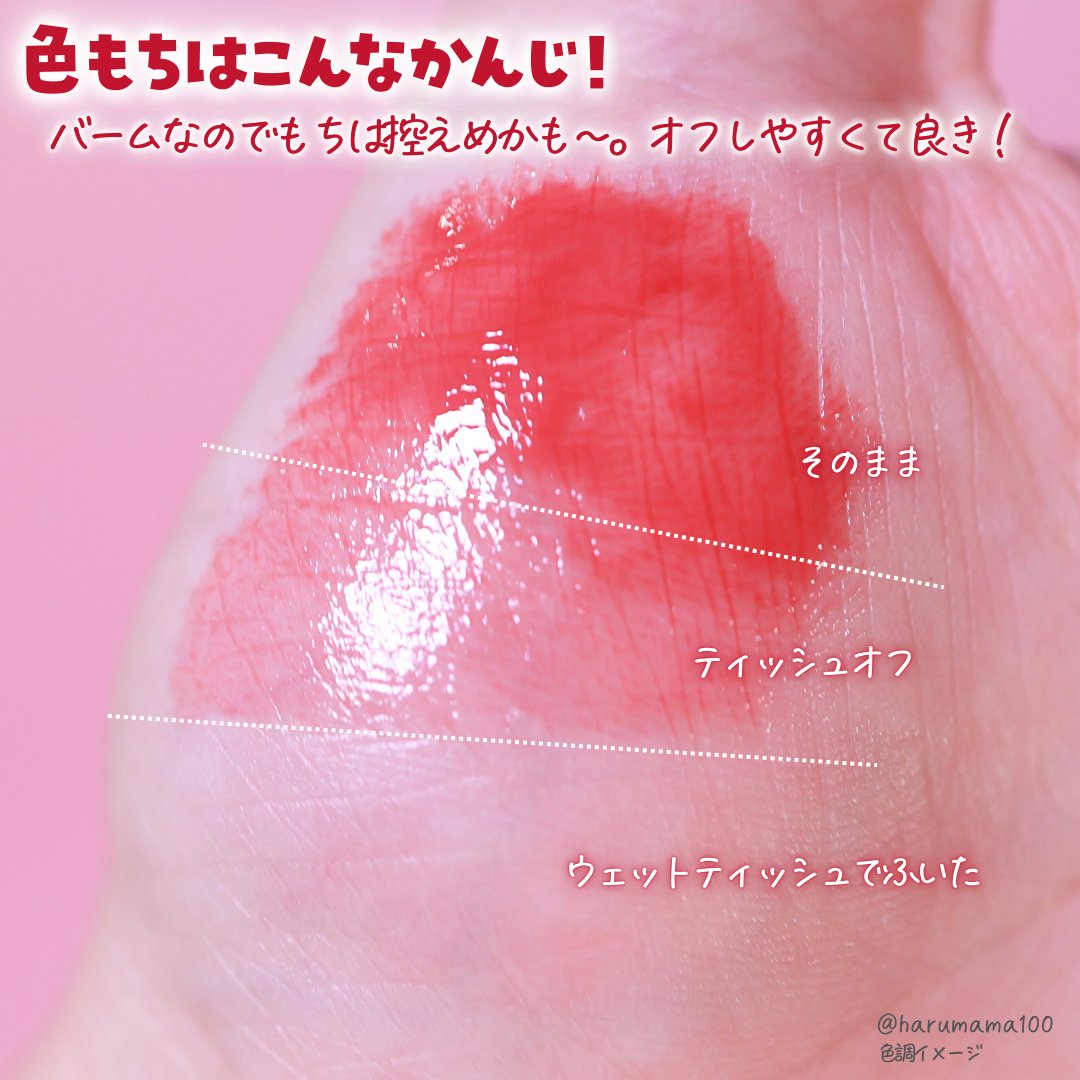 - もちっとした水膜で弾けそうなツヤリップ 1.軽い塗り心地のなめらかで透明な水爆弾ツヤ 2.塗った瞬間から唇を鮮やかに彩る多彩なカラーバーム 3.植物性保湿オイルでしっとりもっちり保湿バーム