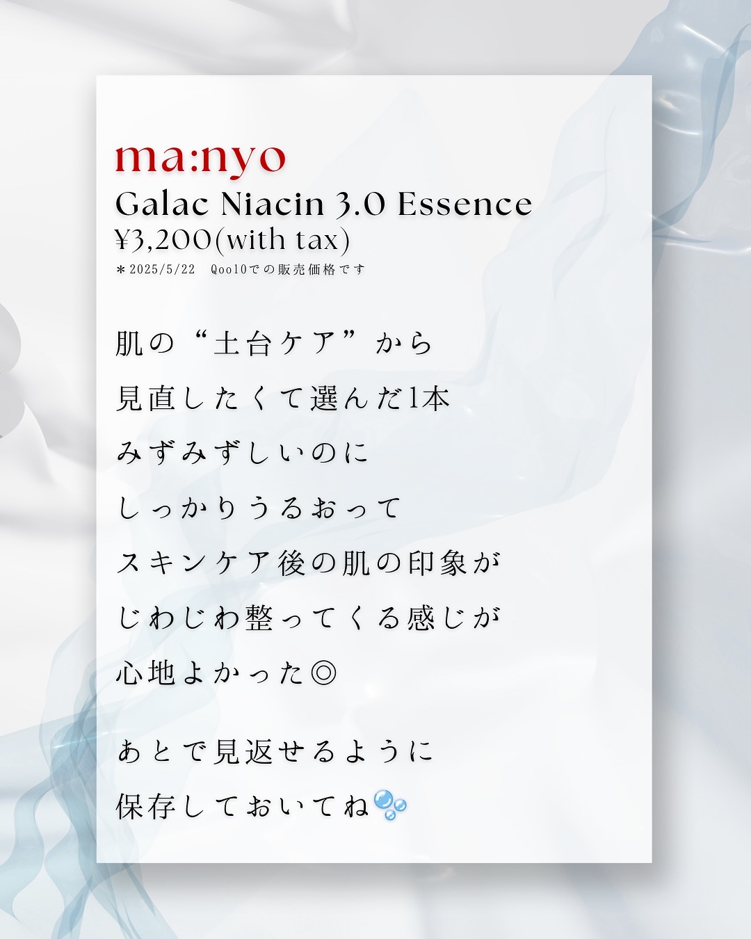 ..肌の“ベース作り”にこれ使ってます☝️💕ma:nyo・GalacNiacin3.0Essence・60ml・3,200円@manyo.japanくすみ・乾燥が気になってきたこの春からベース美容液として使い始めました😚実はこの3.0以前の2...