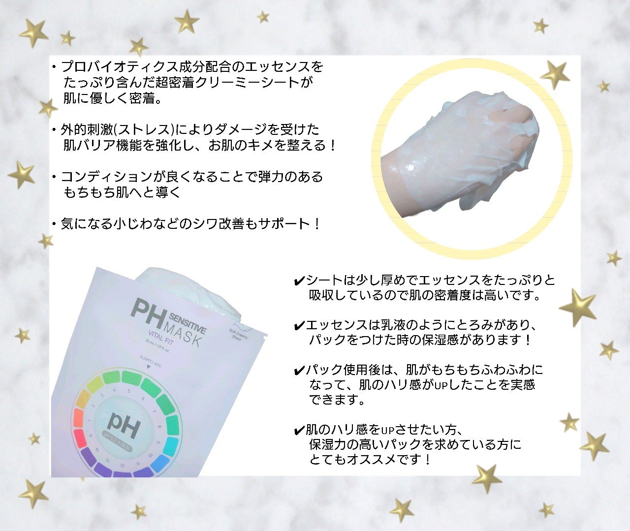 お肌のpHバランスを整え弾力やバリア機能の強化をサポートするマスク。 プロバイオティクス成分配合のエッセンスをたっぷり含んだクリーミーシートが肌に優しく密着。 外的刺激(ストレス)によりダメージを受けた肌バリア機能を強化し、お肌のキメを整えます。さらに肌コンディションが良くなることで弾力のあるもちもち肌へと導きます。 気になる小じわなどのシワ改善もサポートする低刺激フェイスマスクシート。 皮膚低刺激テスト完了済により敏感肌の方もご使用いただけます。