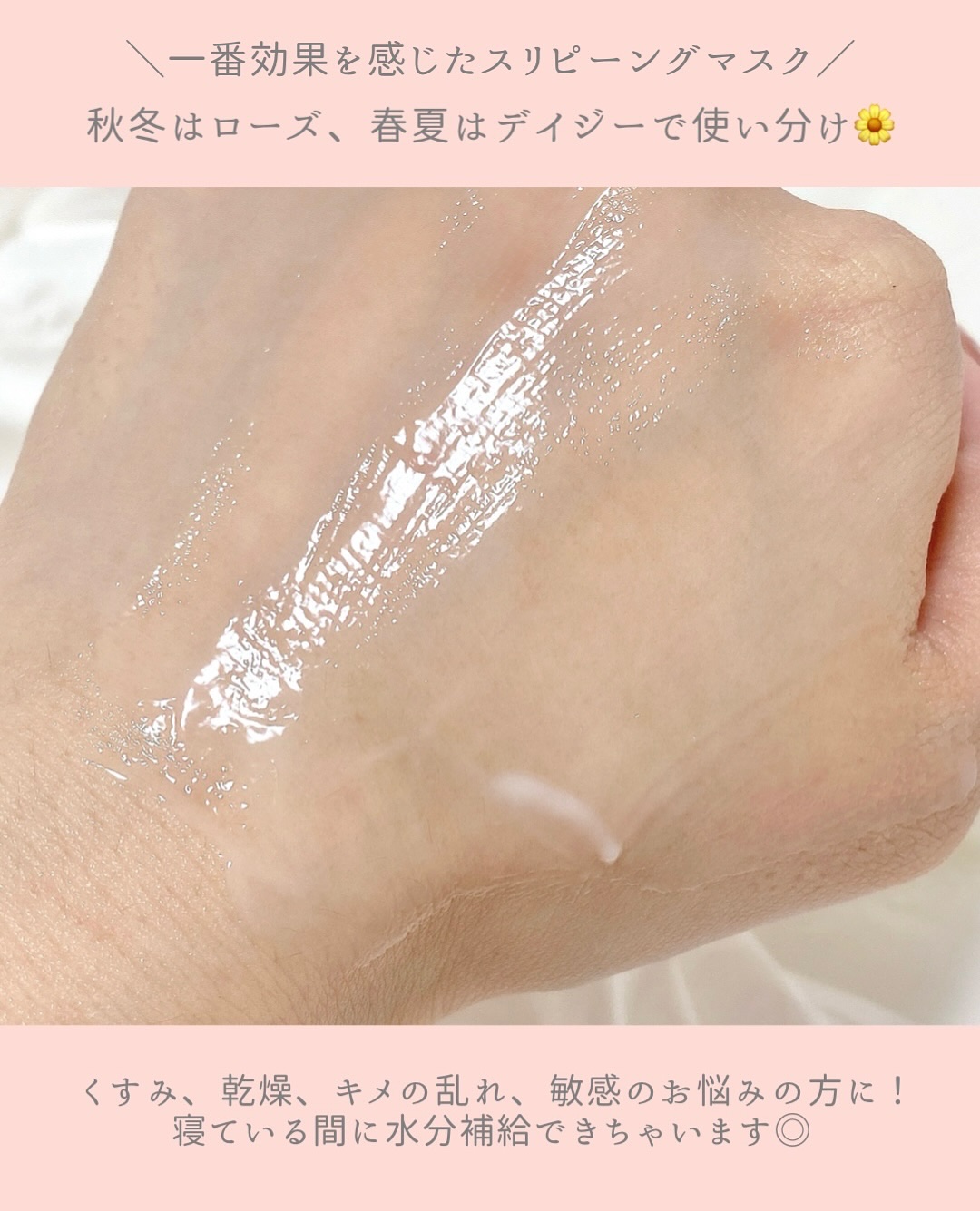 - 夏の肌が受けるダメージを、眠っている間にケア。白く透き通るような花、デイジーのスリーピングマスクが限定登場。紫外線が猛威をふるう季節の肌のために作られたデイジーのスリーピングマスク。みずみずしいジェルテクスチャーによるひんやりとした体感とともに、うるおいと透明感*1をたっぷりと与え、紫外線をはじめとする外的ストレスを受けた肌をケアします。キーとなるのは、白い花を咲かせるデイジーのエキス*2。さらに3種のツヤ成分(ナイアシンアミド、ビサボロール、α-アルブチン)を掛け合わせることで、肌をやわらかくしてキメを整え、乾燥によるくすみをケアし、クリア*1な印象へと導きます。やわらかなジャスミン*3に明るいスイートオレンジ*4を掛け合わせた、爽やかな希望を感じる香り。*1うるおいを与えて透明感をもたらす *2ヒナギク花エキス *3マツリカ花油 *4スイートオレンジ果皮油