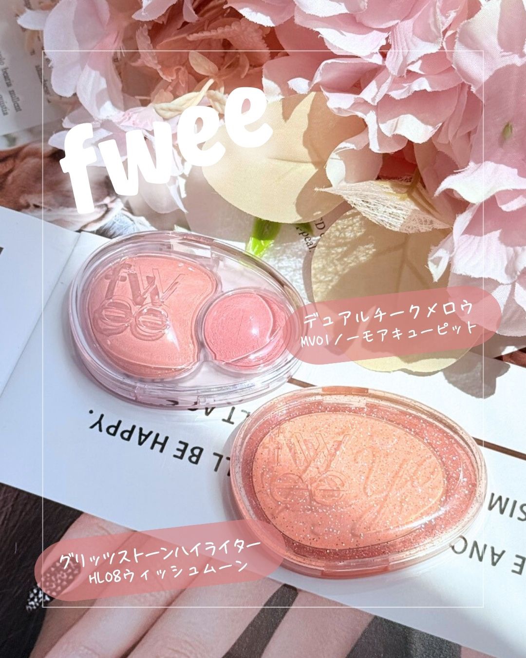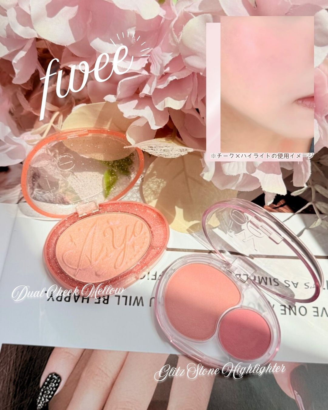 .fweeのモニターに参加してます🙂🩵@fwee_makeup_jp自分の肌トーンに合ったポイントメイクで血色感を与えてくれるおすすめな組み合わせ🤍わたしはチークはブルベカラー、ハイライトはイエベカラーをチョイス😌✨でもハイライトはピーチピン...