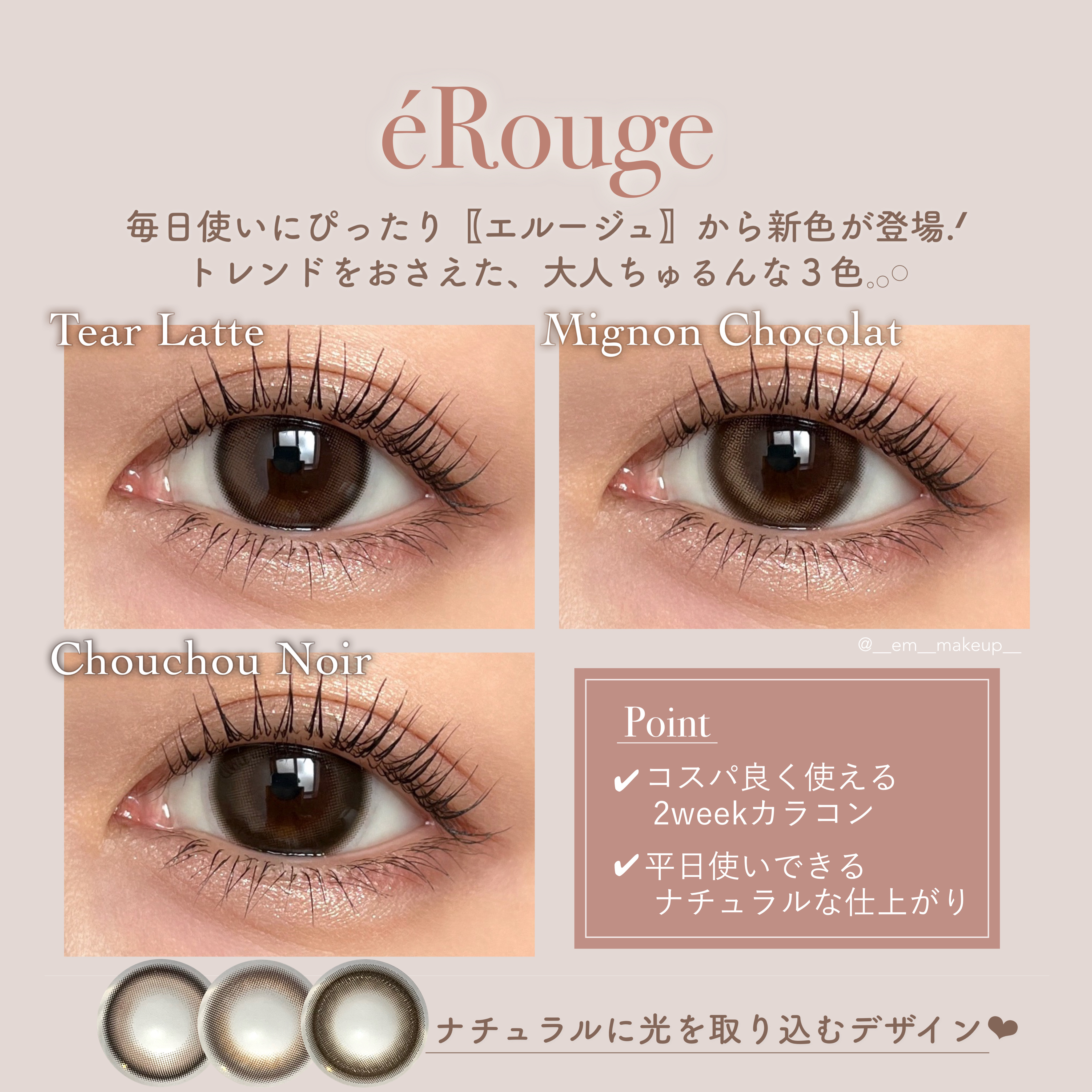 毎日使いたくなる極旬♡ちゅるんéRouge2weekTearLatteMignonChocolatChouchouNoir1箱6枚入2640円(税込)2weekカラコンéRougeから光を取り込む♡大人ちゅるんな新色3色が仲間入り!◇Tear...