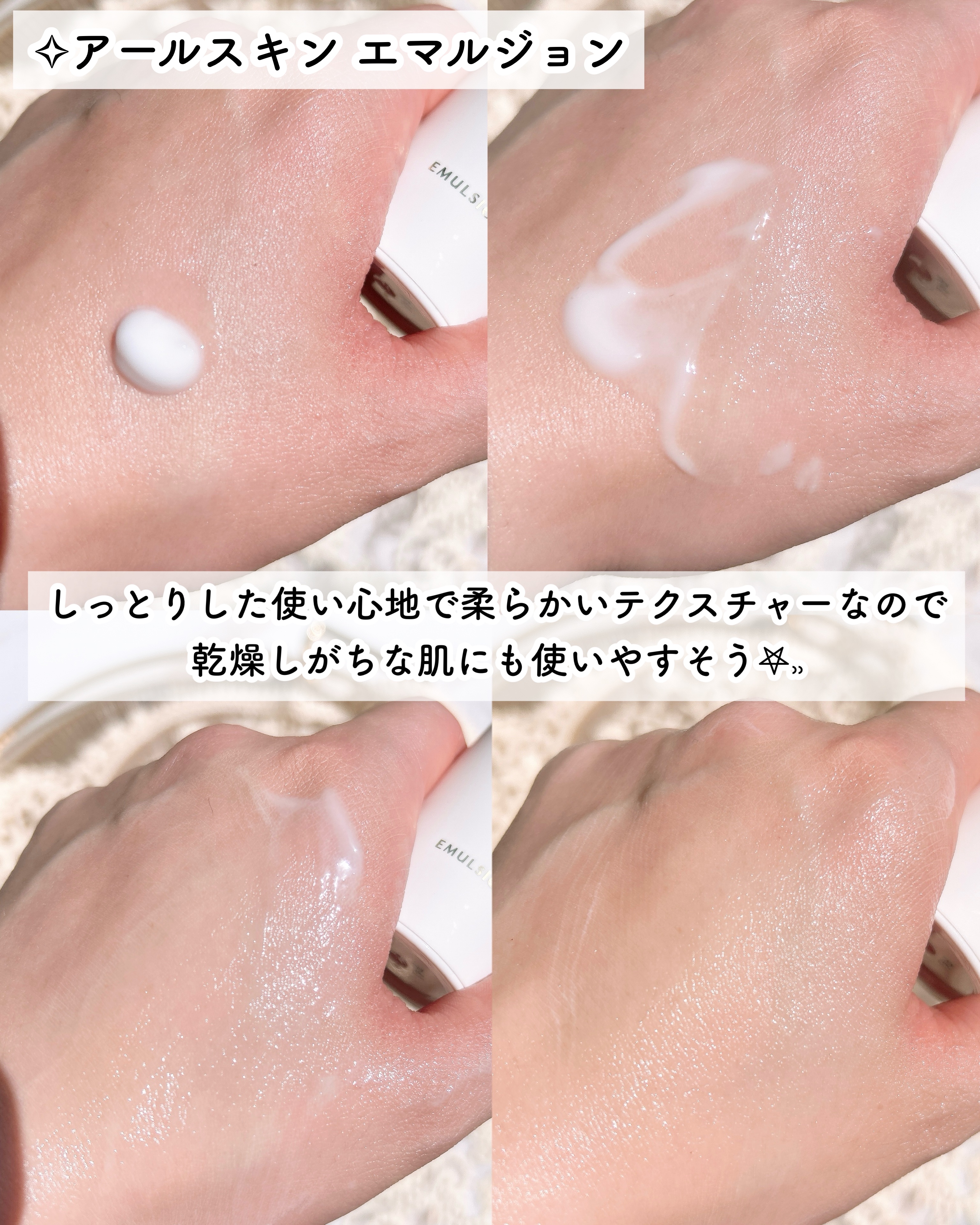 アルカミーの特徴1:刺激をブロック2:過剰な防御反応を抑える3:すみやかに赤みを抑える 少しとろみのあるテクスチャーで肌にしっとりと馴染みます。肌に馴染ませる時にやさしくハンドプレスするのがおすすめ🙌 オイルフリーなので使用感はさっぱりに近いかな🤍保湿はされているけど肌の外側にべたつきが残らないよ💫 化粧水と一緒に使用することでより赤みが軽減されるように感じました。(私の場合は小鼻の周りの赤み) 少しジェルっぽいテクスチャーで肌馴染も良かった!オイルフリーだからさっぱりした使い心地が好きな人や軽めの使用感が好きな人に使ってみてほしいな🦄