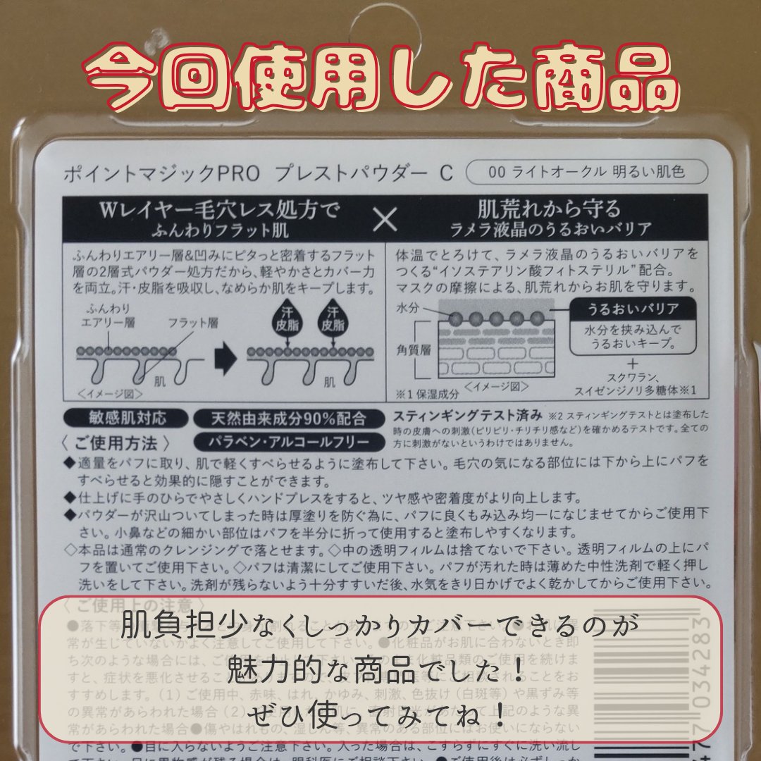 黒龍堂様からプレストパウダーを提供していただきました。ポイントマジックPRO プレストパウダーC00ライトオークル定価:1540円セミマットでサラサラな仕上がり。ふわふわのパフで載せると、毛穴が綺麗にぼかせるよ!仕上がりとしては、毛穴を「隠す...