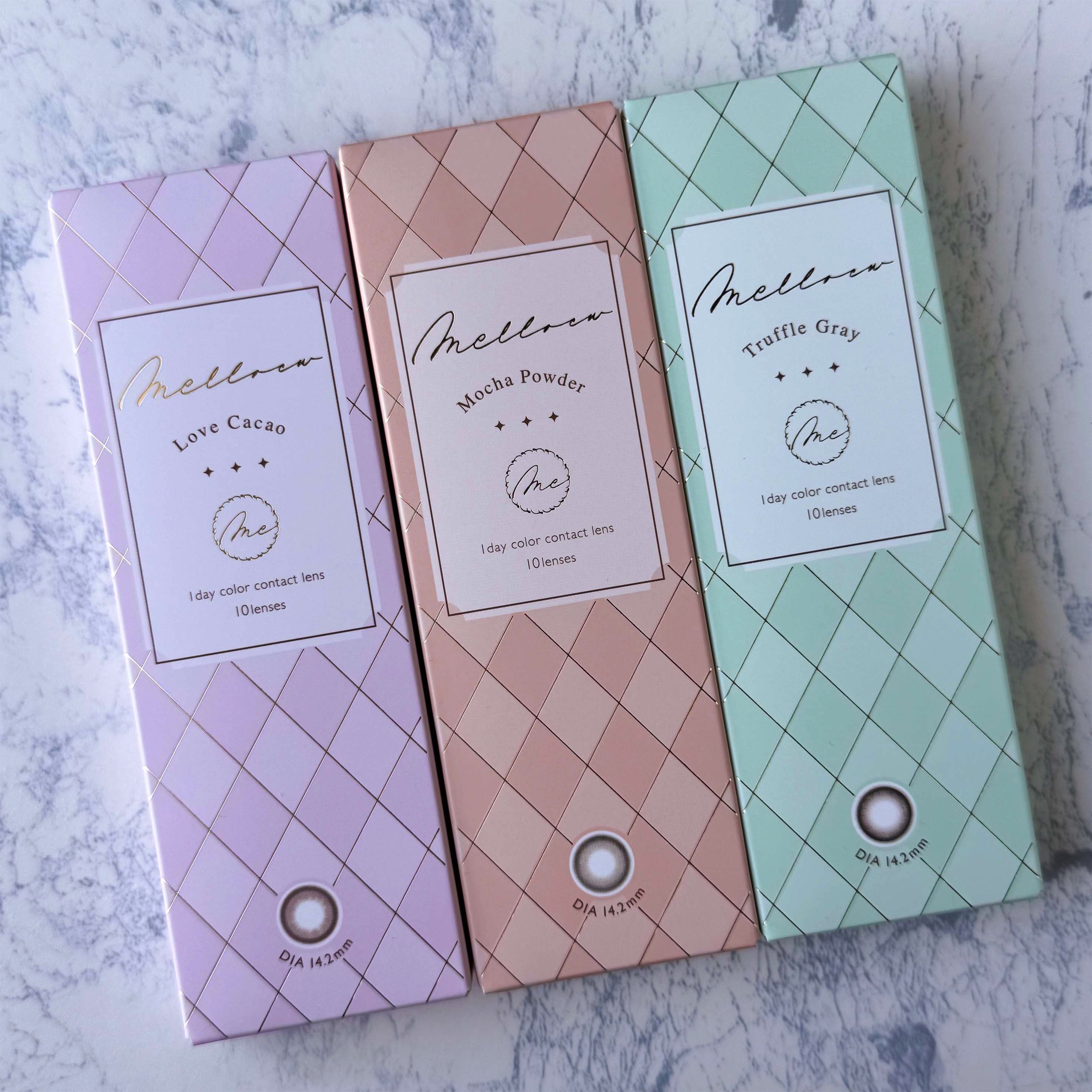 - ※2025年6月以降、商品パッケージ裏面・側面の一部表記を順次変更いたします。尚、これにかかる商品の交換・返品は承っておりません。 ふわっと漂う多幸感 キラキラとした瞳 そんな多くの人が憧れる印象はmelloewで作れる! 王道盛れからあざと盛れまでどんな盛れも叶うラインナップで瞳をコーディネート☆ Cotton Ring(コットンリング) DIA14.2㎜/着色直径13.5㎜ 溶け込みベージュ×くっきりフチ 写真でもリアルでも盛れちゃう♪ Silky Pearl(シルキーパール) DIA14.2㎜/着色直径13.5㎜ ツヤっぽベージュ×細フチ 垢抜けた印象にしたい方におすすめ♪ Truffle Gray(トリュフグレー) DIA14.2㎜/着色直径13.4㎜ おしゃれモテ♡ 濃いめグレージュ×ぼかし細フチ 品よく盛れるお嬢様な瞳に Pure Nude(ピュアヌード) DIA14.2㎜/着色直径13.2㎜ 絶妙ヌーディカラー×グラデフチ お仕事やカラコン初心者にもおすすめ♪ Brown Chou(ブラウンシュー) DIA14.2㎜/着色直径13.6㎜ まろやかブラウン×ぼかしフチ 日常使いにもおすすめ♪ Mocha Powder(モカパウダー) DIA14.2㎜/着色直径13.6㎜ リピ確モテ♡ ふわふわモカ×くりっとフチ 絶対盛れちゃう甘い瞳に Love Cacao(ラブカカオ) DIA14.2㎜/着色直径13.0㎜ 清楚モテ♡ とろふわチョコレート×こっそりフチ バレずに盛れちゃう瞳に カラーコンタクトレンズの不適正使用による眼障害の危険性等などがあります。 ●コンタクトレンズは高度管理医療機器です。不十分な洗浄・消毒など不適切なケアや、長時間・交換期間を超えた装用により、アレルギー性結膜炎、角膜感染症、角膜潰瘍等の重篤な眼障害が発生する危険性があります ●ご使用前に取扱説明書を確認してください 使用上の留意事項 ●眼科医院等を受診してからお求めください ●眼に異常を感じたら直ちにレンズ使用を中止し、お近くの眼科等で診察を受けてください ●医師の指示にしたがってご使用ください ●コンタクトレンズを装用する場合、自覚症状がなくても、眼科医院等での定期検査を受けてください ●レンズに不具合がある場合は使用しないでください