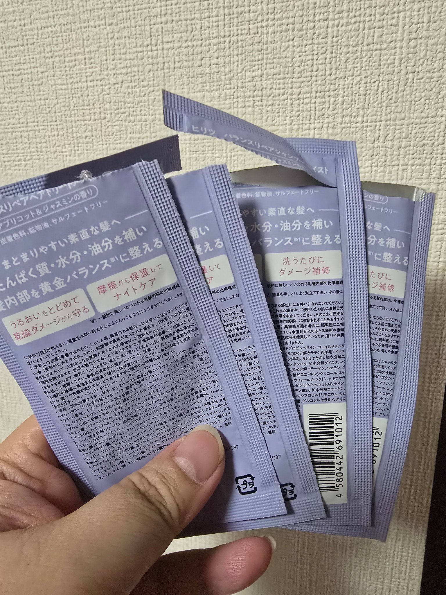 hirituヒリツ・バランスリペアヘアオイル スムース¥1,540・バランスリペアシャンプー/ヘアトリートメントモイスト¥121(しっとりとした仕上がり。パサつきや広がりやすい髪の毛に。ジャスミンとアプリコットを加えた香り。)・バランスリペア...