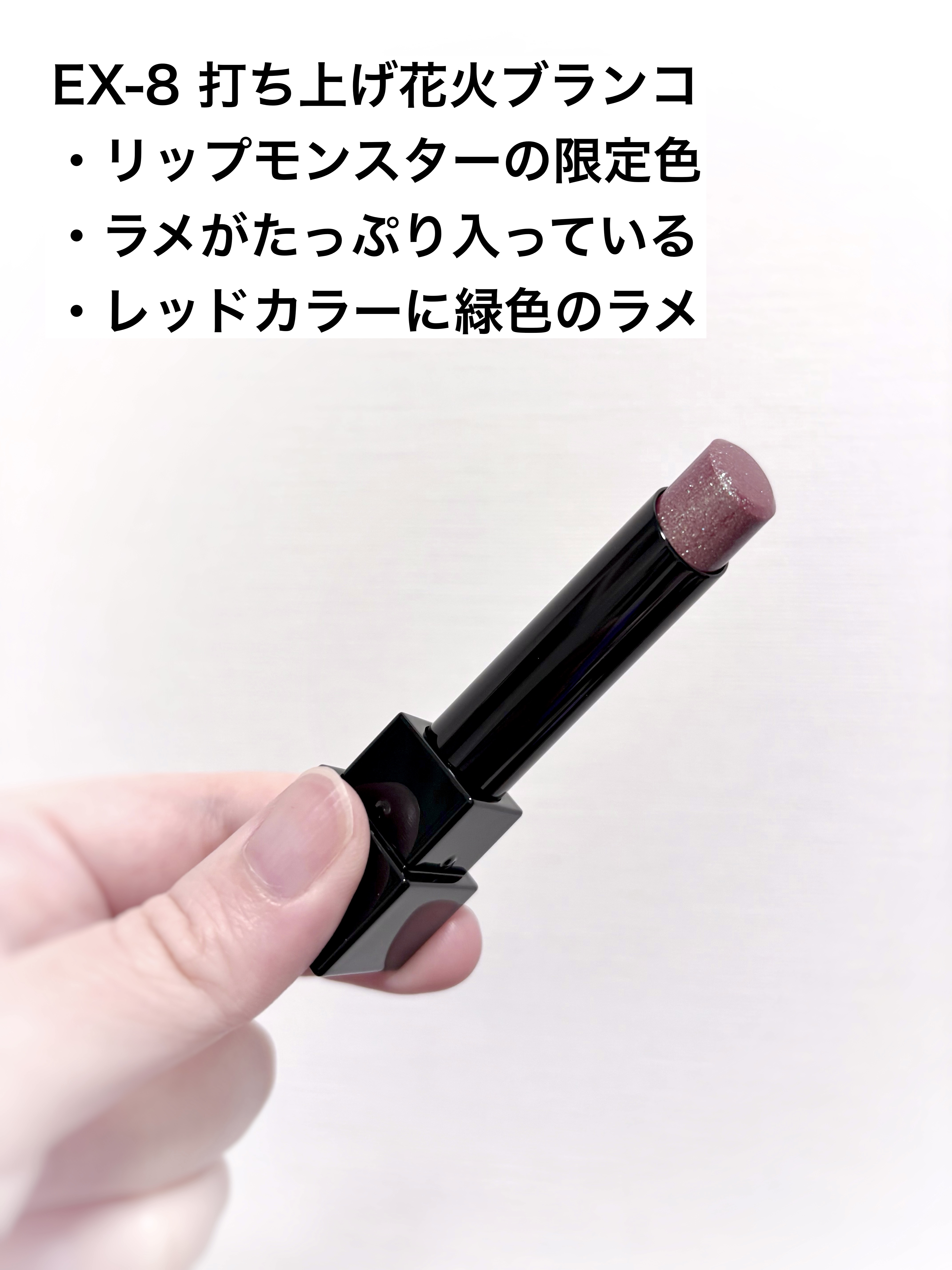 - 落ちにくさも美発色もよくばりたい、つけたての色が長時間持続する人気の口紅リップモンスター。 唇から蒸発する水分を活用して密着ジェル膜に変化する独自技術※で、つけたての色が長時間持続。 高発色&保湿。 ※当社独自の色持ち技術 ■花火のようにまぶしくきらめく 繊細なラメが際立つ限定色 EX-6 ピンクカラー×青ラメ【ロケット花火流星群】 EX-7 オレンジカラー×黄&緑ラメ【100万発の線香花火】 EX-8 レッドカラー×緑ラメ【打ち上げ花火ブランコ】 ■深みレッド系カラーの限定色 EX-9 戦慄の喜笑 (限定色) EX-10 狂気の怒号 (限定色) 【2025クリスマスコフレ】 落ちにくいリップモンスターから、唇の血色感を底上げする ホリデーシーズン限定の熱感ニュアンスベージュ系カラー登場。 EX-11 紅煙宿る贈り物(限定色):ボルドーベージュ系 EX-12 盗まれた1224mの星光(限定色):キャメルベージュ系