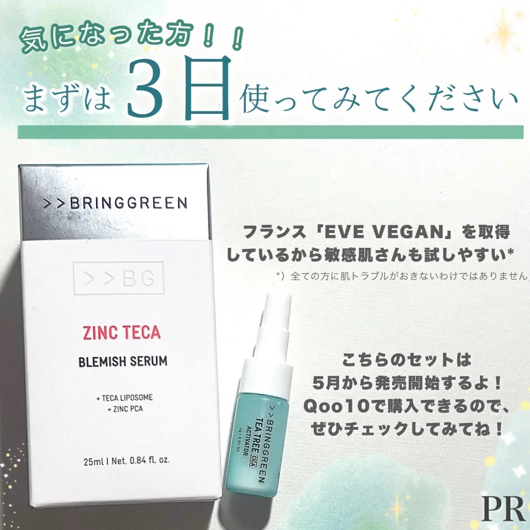 - ■ブランドメッセージ 悩める肌*にブリングリーン SPEED VEGAN CARE *乾燥による 毎日直面する肌悩み。すべての肌悩みに素早く答えるブランドであるために、親しみのある植物由来成分とこだわりの原料を配合。 ブリングリーンは、スピードヴィーガンケアを提案する自然派スキンケアブランドです。 (フランスの「EVE VEGAN」を取得) ■ジンクテカBセラムセットについて ジンクテカBセラムに、ティーツリーCパウダー2gがセットになった一つの商品で、5月から発売の新商品です。 メインメッセージ:余分な皮脂を整え肌トラブル*²を全力でサポート 愛称:お守りセラム #お守りセラム #オリーブヤングNo1*¹肌トラブル*²ケアセラム #ジンクテカ™*³ 【ジンクテカBセラムについて (愛称;お守りセラム)】 なぜ“お守りセラム”? 気分もダウンさせる肌トラブル*² 。CICAがたっぷり入ったジンクテカBセラムが10~20代の肌トラブル*²を守ってあげたいという思いが込められています。 1)こだわりのW独自成分!ジンクテカ™*³&ティーツリーシカ™*⁴配合 敏感肌のケアに本気のブリングリーン。植物由来の成分で誕生したティーツリーシカ™*⁴だけでなく ツボ草(CICA)*⁵を高濃縮*⁶した独自成分ジンクテカ™*3がお肌の油・水分バランスを整え、短期間で余分な皮脂による肌トラブル*2に集中アプローチ! ①パワーアップした*6CICA、独自成分”ジンクテカ™*¹ お肌の油・水分バランスが乱れると、余分な皮脂により毛穴が広がり肌トラブル*2の原因に。 理想的な成分配合を目指して誕生したこだわりのジンクテカ™*³が、敏感なお肌に集中アプローチします。 ジンク(PCA亜鉛):毛穴目立ち*⁷をケアし、お肌の油分を整えます。 テカ(アシアチコシド、アシアチン酸、マデカシン酸):ツボ草(CICA) *⁵の重要アクティブ原料。高純度*⁶パウダーで敏感なお肌のゆらぎにアプローチします。 ②独自成分ティーツリー™*⁴ ブリングリーンならではの独自技術でチェジュ産こだわりの5種類のティーツリーコンプレックス*⁸とシカ*⁹をブレンド。 お肌の水分&ゆらぎにしっかりとアプローチし、キメの整ったすこやかな素肌を保ちます。 2)お肌のゆらぎだけでなくくすみ*²ケアまで叶う 植物性ムチン*¹⁰が肌バリアをサポートし、4-テルピネオール *¹¹がお肌のゆらぎに徹底アプローチ。 さらに、ナイアシンアミド*¹²配合で、肌キメを整えくすみ*²まで同時にケアします。 3)とろみテクスチャーで抜かりなくケア!テカリポソームで安定度を高めてパワーアップ*6 もちっととろみのあるテクスチャーながら角質層のすみずみまで薄く均等になじみます。 さらに、TECA粒子を約25nmにナノリポソーム化し、テクスチャー自体も安定させお肌への浸透*¹³にこだわりました。 【セットになって登場するティーツリーCパウダーについて】 ジンクテカBセラムと一緒に使うと肌トラブル*²集中ケアができるパウダーです。 厳選した成分を詰め込んだ肌トラブル*²ケアへの高濃度*⁶スペシャルパウダー。 特に肌トラブル*²が気になる際にセラムにトントン!と混ぜて使うと、余分な皮脂を整えて肌トラブル*²にアプローチします。 (肌トラブル*²ケアのための成分:酸化亜鉛*¹²&PCA亜鉛*¹²、ティーツリーシカ™*⁴、テカ*¹⁴、カラミン*¹²、アラントイン*¹²、グリチルリチン酸2K*¹²) とろみのあるジンクテカBセラムに混ぜて使うとセラムがさらっとした使用感に変わるのも特徴です! [注釈] *1 2024年オリーブヤングの商品名に「トラブル」というキーワードを含むエッセンスカテゴリー内の商品の売り上げ基準(オリーブヤング調べ)、*2 乾燥による、*3 PCA亜鉛、アシアチコシド、アシアチン酸、マデカシン酸(全て整肌成分)、*4 ティーツリーエキス、ティーツリー葉エキス、ティーツリー葉水、ティーツリー花/葉/茎エキス、ティーツリー葉油、ツボクサエキス(全て整肌成分)、*5 アシアチコシド、アシアチン酸、マデカシン酸(全て整肌成分)、*6 シリーズ内比、 *7 うるおい不足による、*8 ティーツリーエキス、ティーツリー葉エキス、ティーツリー葉水、ティーツリー花/葉/茎エキス、ティーツリー葉油(全て整肌成分)、*9 ツボクサエキス(整肌成分)、*10 アシタバエキス、オクラ果実エキス、タイワンツナソ葉エキス、ハス根エキス、ヤマノイモ根エキス(全て整肌成分)、*11 香料、*12 整肌成分、*13 角質層まで、*14 アシアチコシド、アシアチン酸、マデカシン酸(全て整肌成分) ※原料の一般的な説明であり、製品に関する効能ではありません