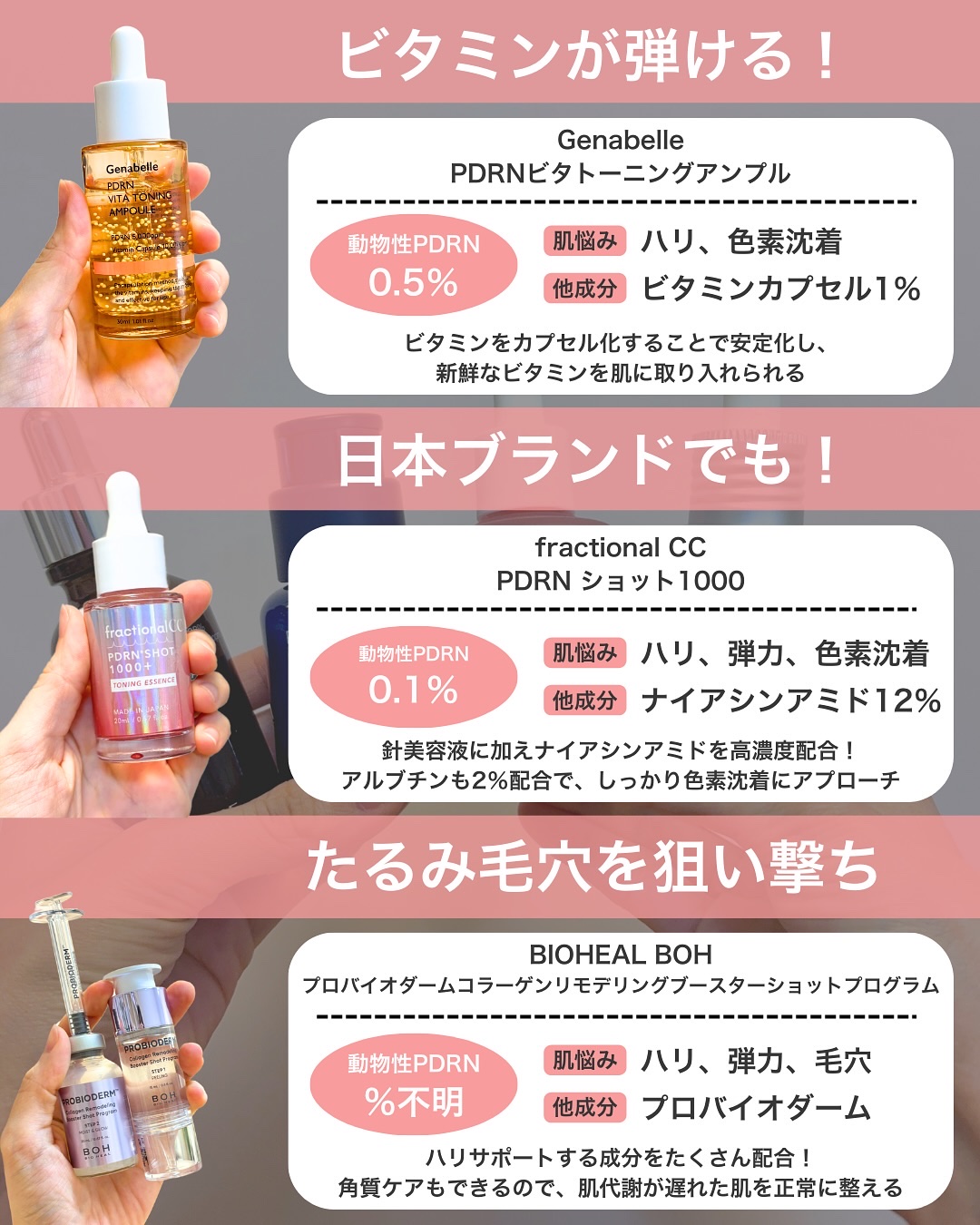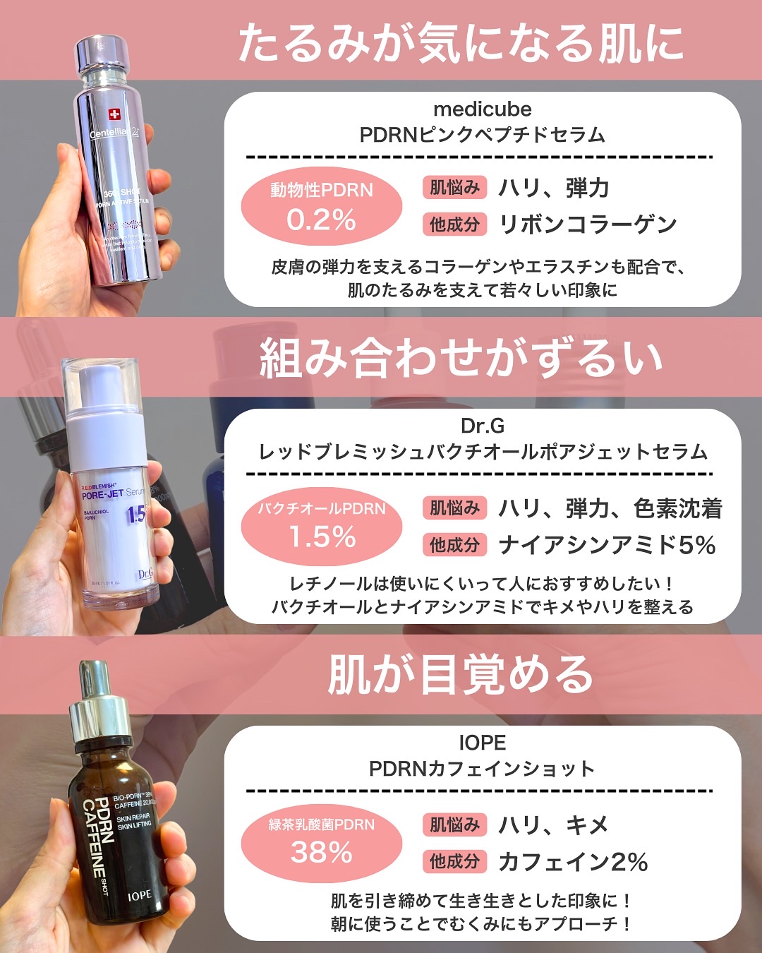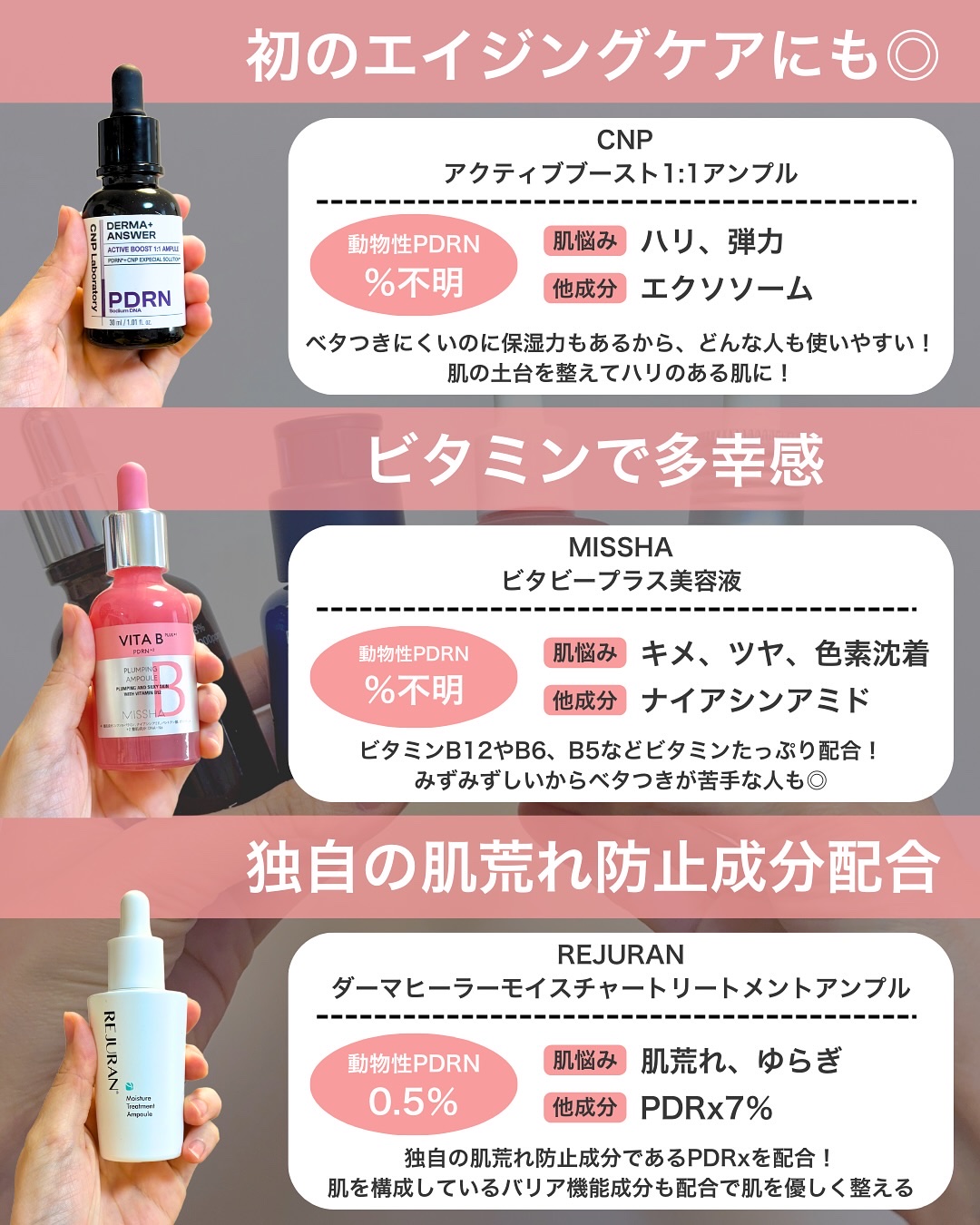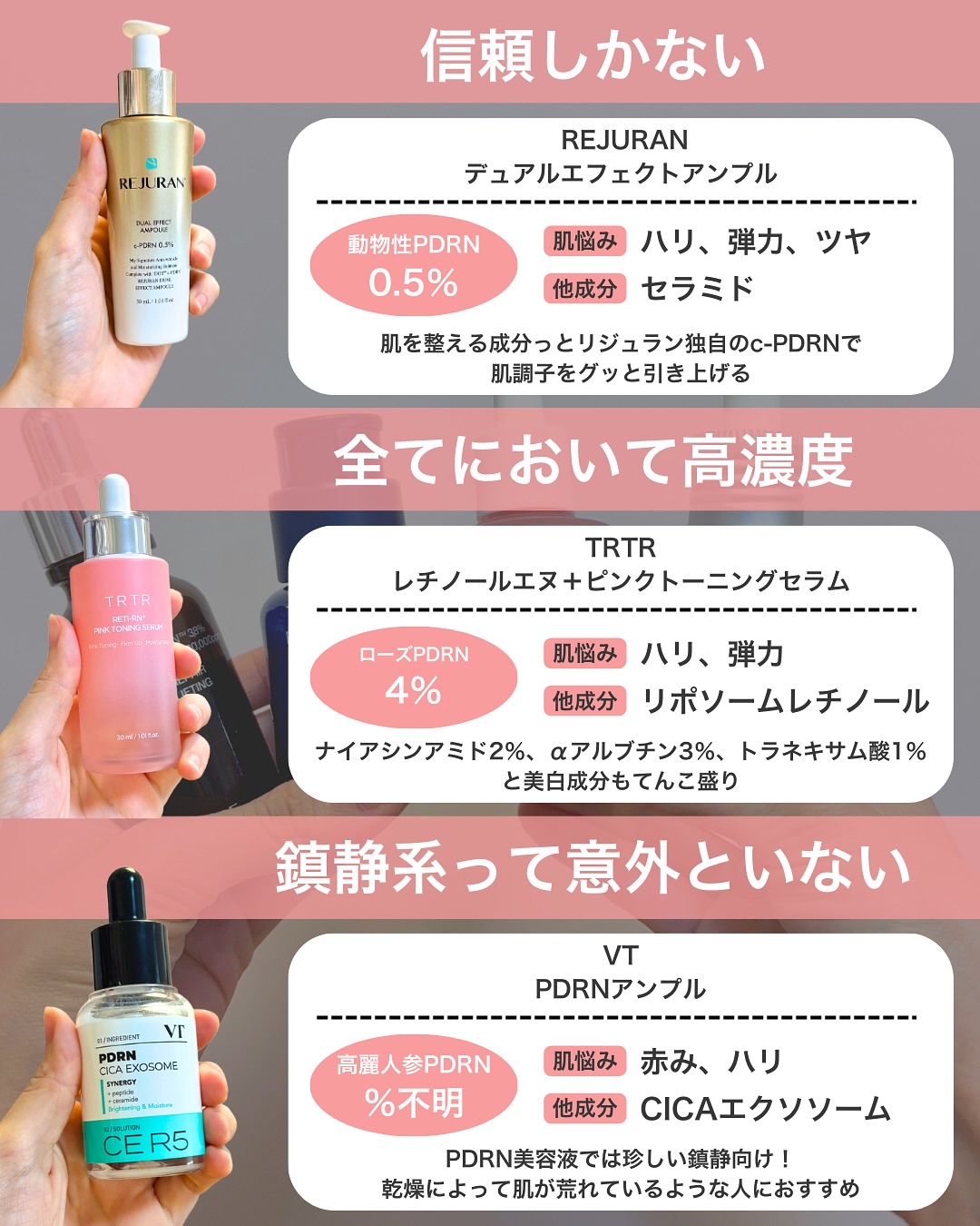 PDRNは韓国から話題になった成分🥰 個人的にPDRNはコツコツ使うことで効果が出てくるものだなぁと感じます! すぐにハリを感じやすいのはVTとセンテリアン でもこれ、別の成分で出てるハリな気がしてる。 アヌアは、ん?グルタチオンの香りする!って思ってよく調べたら大きくは訴求してないけど、調べたらやっぱり入ってたよ!!😳✊🏻