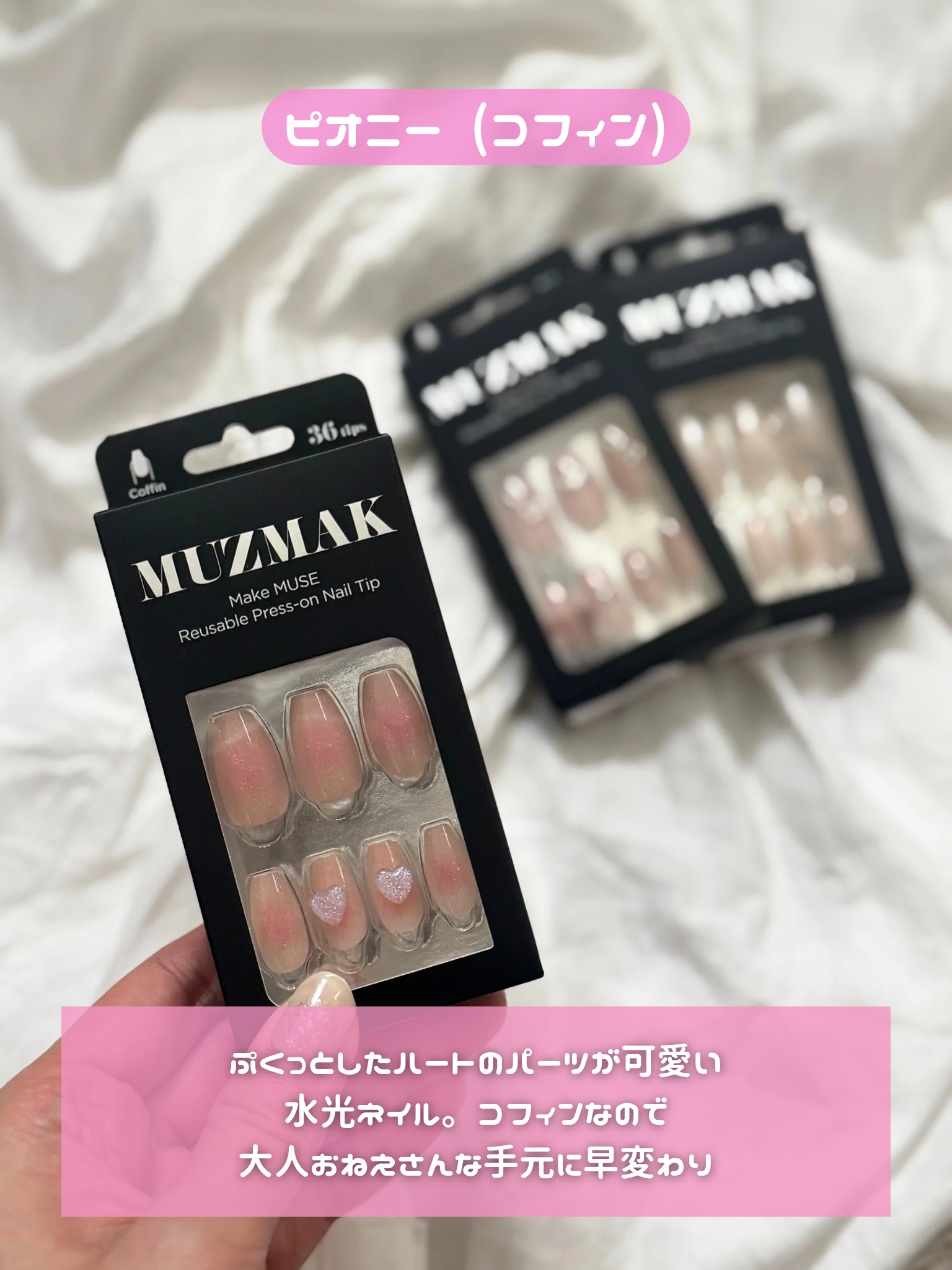 MUZMAK(ミュズマック)01.エンジェルパンク(コフィン)07.シルエット(アーモンド)10.ピオニー(コフィン)耐久性と復元力に優れたリユーザブルネイルチップ💅なんとN回使用可能!ミュズマックオリジナルデザインになっていて、種類も豊富で...