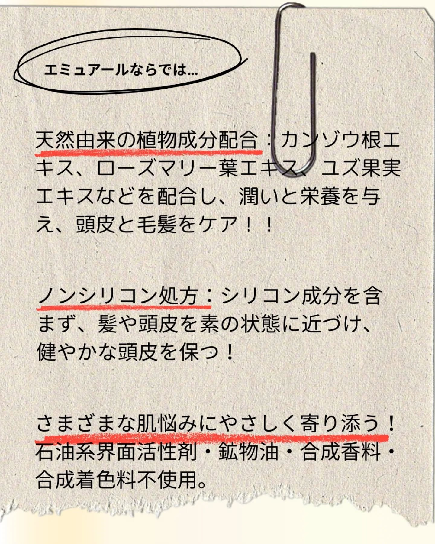 天然ゲルの使い心地がとても良く、ファンデもスキンケアも大好きな化粧品ブランド<エミュアール>。 保湿力や使い心地の良さがとても気に入っている天然ゲルが配合されているなんて嬉しすぎます🥰 アミノ酸系洗浄成分が採用されており、頭皮や髪に負担をかけずにすっきりと洗い上げてくれます。