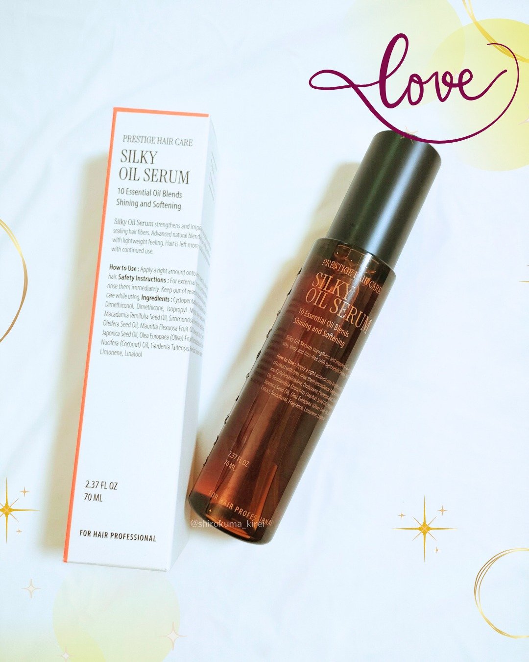 - <SILKY OIL SERUM> シクロペンタシロキサン、シクロヘキサシロキサン、ジシロキサン、ジメチコノール、ジメチコン、ミリスチン酸イソプロピル、リモネン、アルガニアスピノサ核油、マカデミア種子油、ホホバ種子油、ババス油、オオミテングヤシ果実油、ヒノキ油、ツバキ種子油、オリーブ果実油、ブラジルナッツノキ種子油、ヤシ油、リナロール、ガーデニアタイテンシス花エキス、トコフェロール、香料