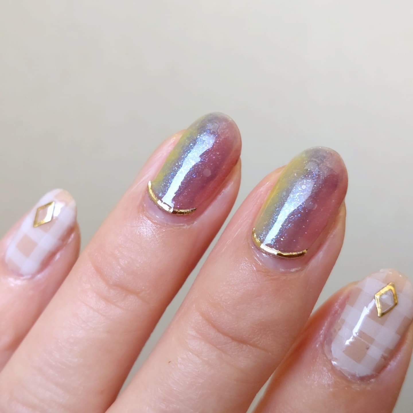 チェックネイル@pa_nail様のプレゼントキャンペーンでいただいた3色を使ったチェックネイル🤍🩷🩵3色を縦と横に塗り重ねて、ふんわりとした印象のチェック柄をつくった透け感を活かしたネイルスウォッチも兼ねて、人差し指と中指、小指にワンカラーで...