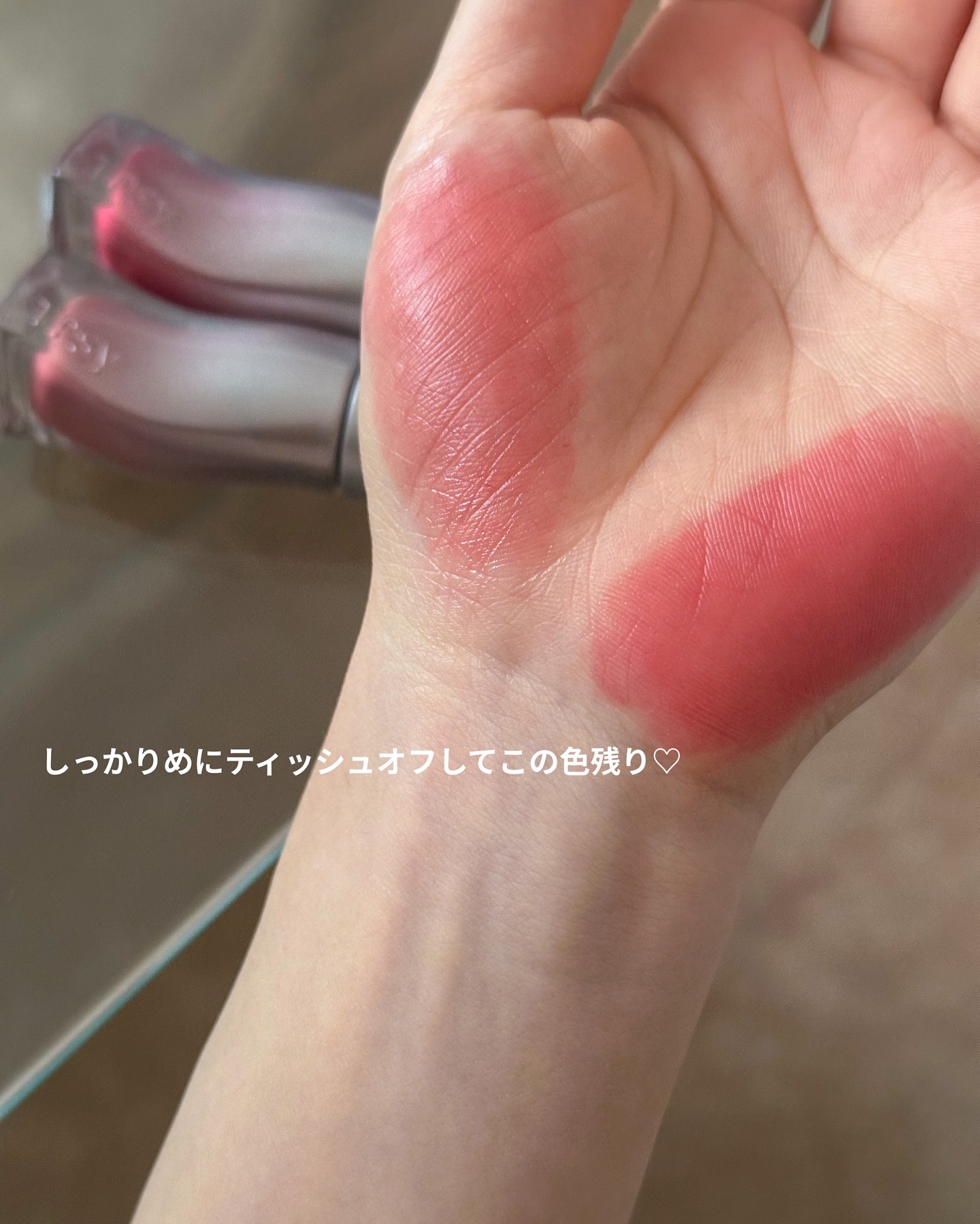 まさにうさぎの舌のような 淡くピュアなピンクカラーで ちゅるちゅる質感が特徴らしいです♡ 王道 美少女リップでみずみずしいちゅるん唇に 他のリップに重ねても◎ガラス玉の白みピンク