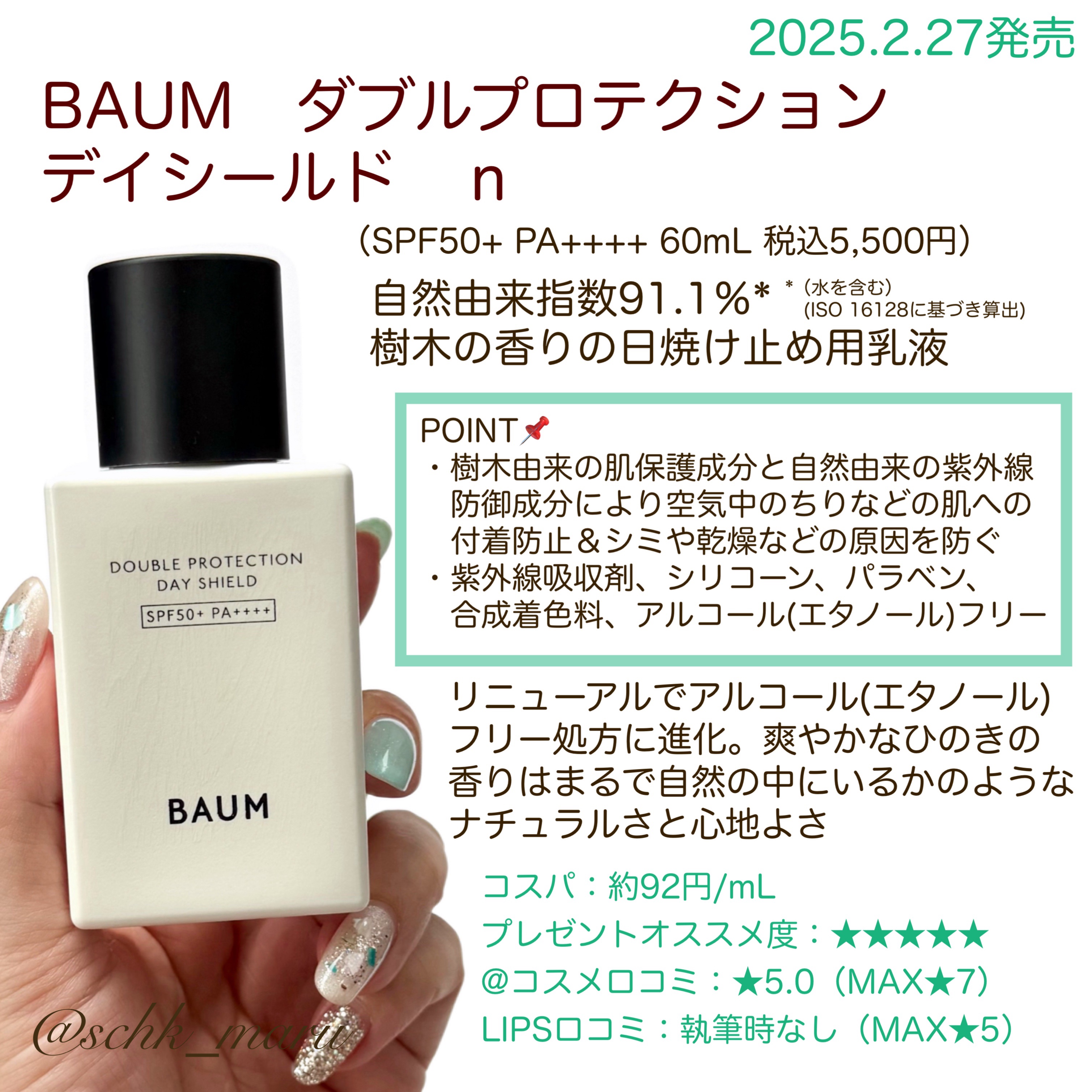 | 日焼け止め・UVケアランキング第49位 | みずみずしくなめらかなテクスチャーで、肌に均一に溶け込むようになじみ、べとつかないのも嬉しい😳 | 詳細を見る | |