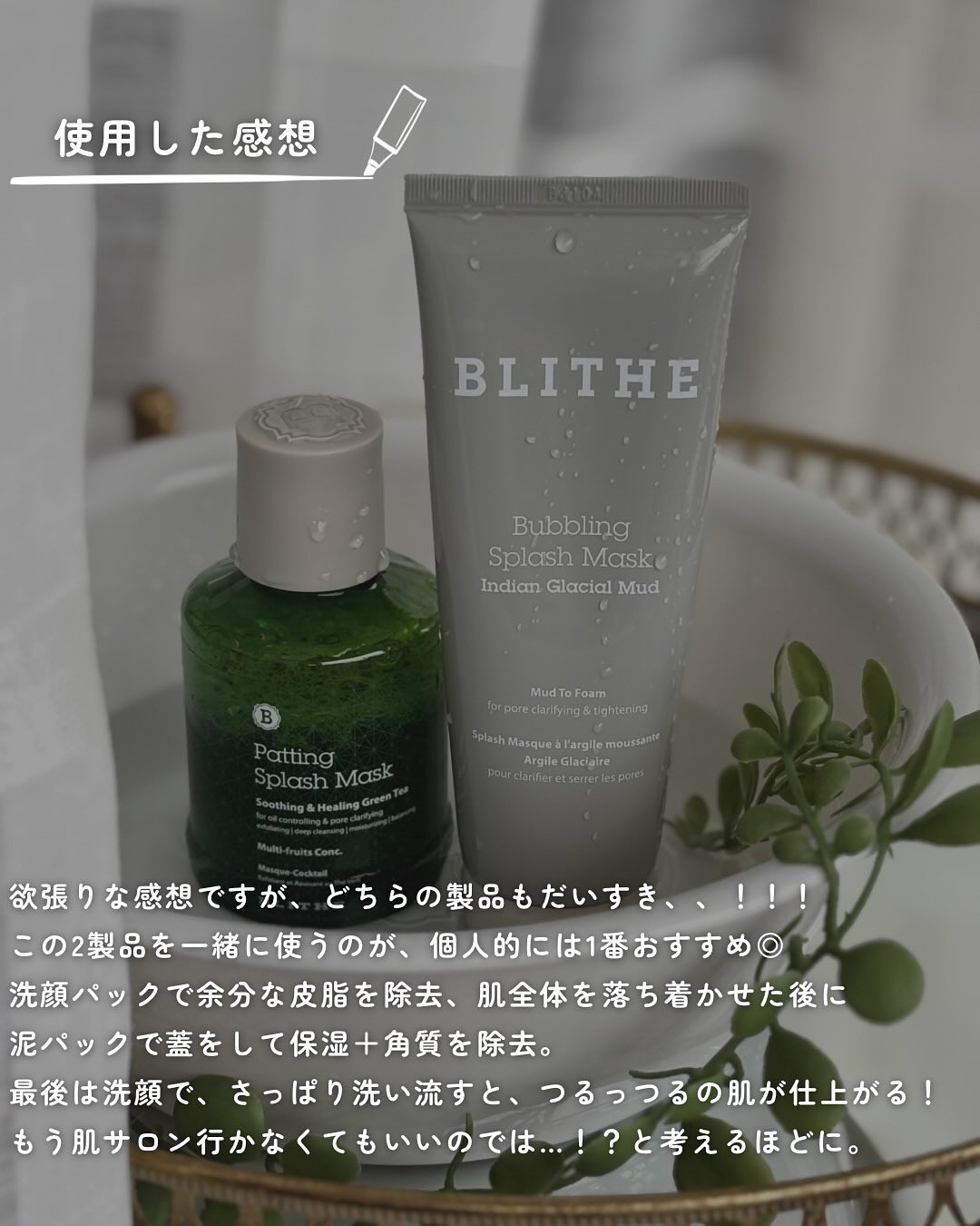新感覚で使えるふたつのマスク✨️🎀item🎀BLITHE💚PattingSplashMaskSoothing&HeelingGreentea🩵BubblingSplashMaskIndianGlacialMud化粧水のようなボトルの方はPat...