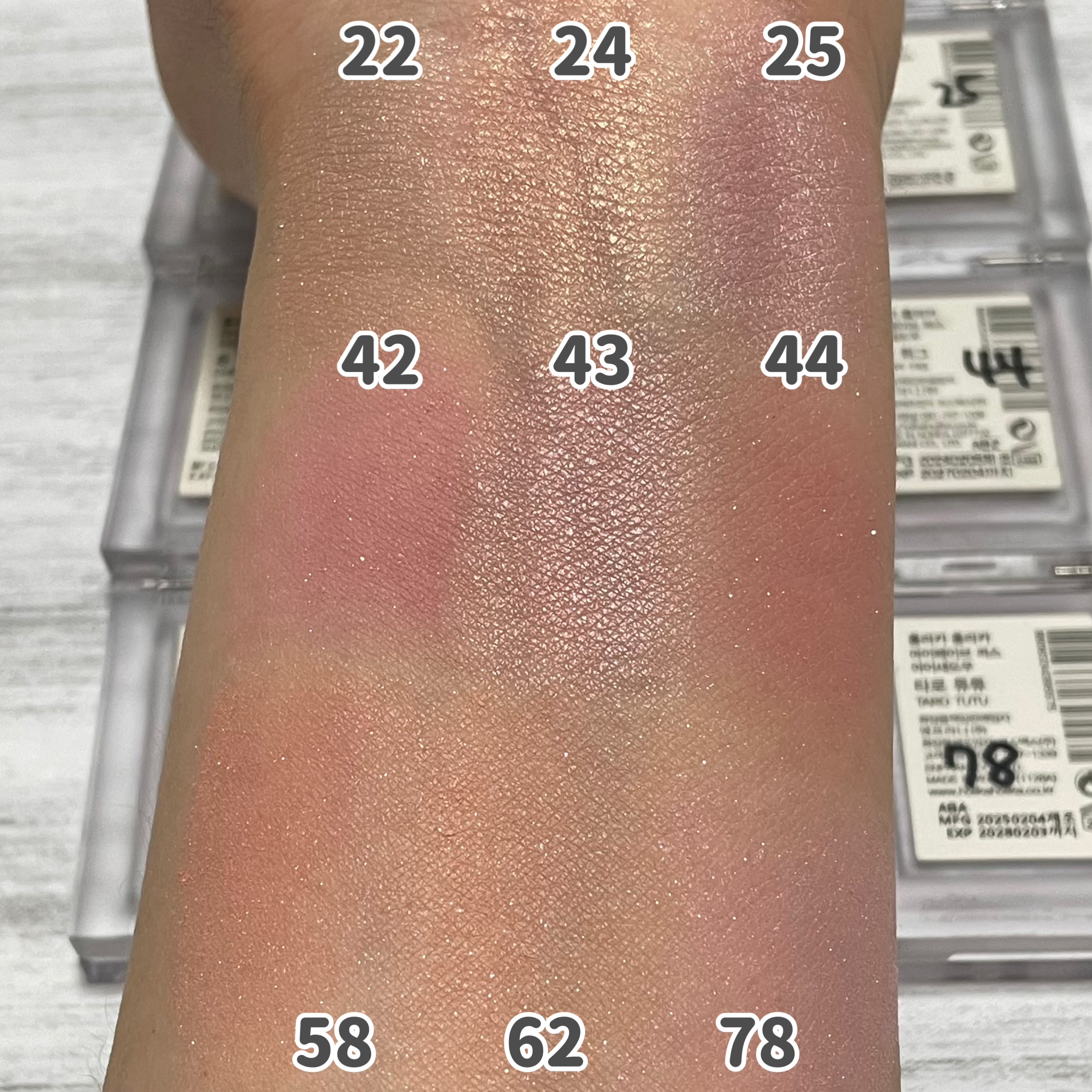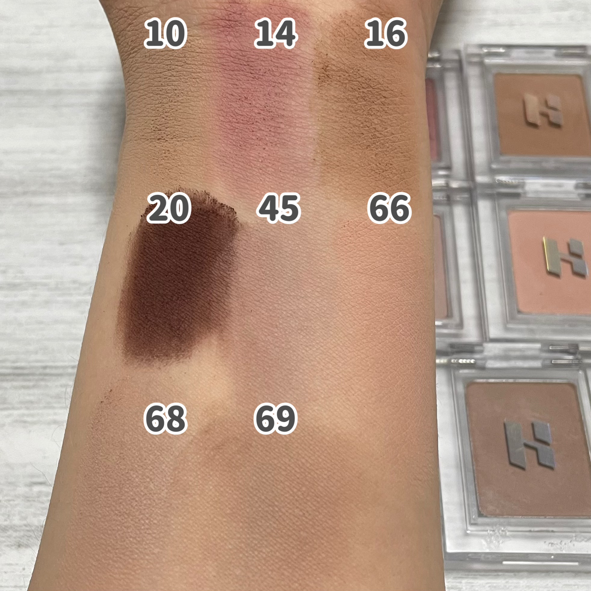 粉質は柔らかく、ふわっと密着します。 10 MUSHROOM マット。グレー系のベージュ。 20 TWO SHOT AMERICANO マット。アイライナー使いにもできるしっかり目のダークブラウン。 22 BEBE パール。涙袋にぴったりのベージュ系カラー。 40 SUPER PINK マット。しっかりと華やかなピンク。 42 CHEW グリッター。ミルクピンクをベースに、ピンクとゴールドラメ入り。 45 BLUSH GREY マット。くすみグレー。 38 PINK ATTENTION 繊細なラメ。偏光パールぽく輝くピンクトーンのハイライト。