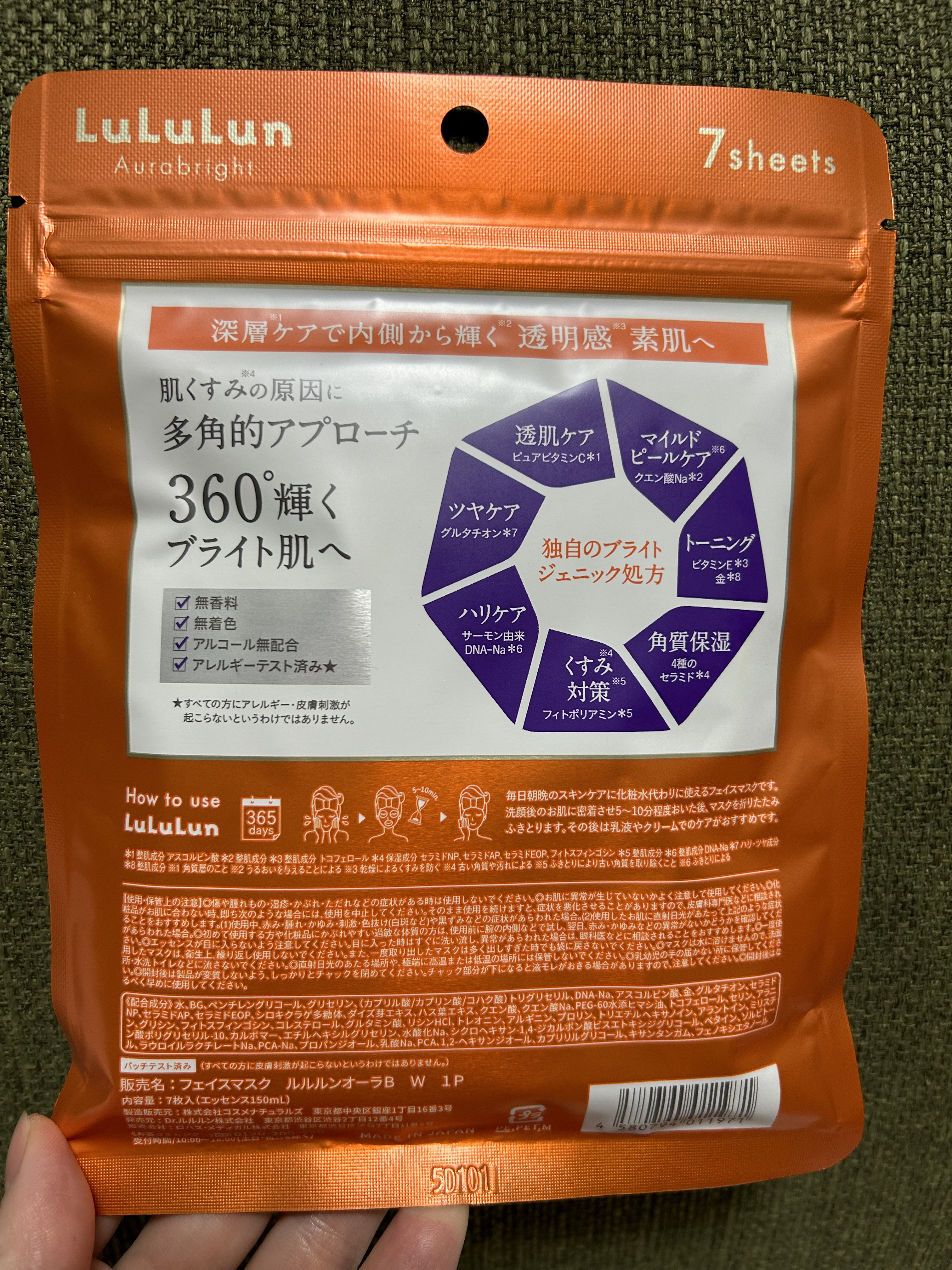 - <ルルルン オーラブライトマスク W 28枚入> 水、BG、ペンチレングリコール、グリセリン、(カプリル酸/カプリン酸/コハク酸)トリグリセリル、DNA-Na、アスコルビン酸、金、グルタチオン、セラミドNP、セラミドAP、セラミドEOP、シロキクラゲ多糖体、ダイズ芽エキス、ハス葉エキス、クエン酸、クエン酸Na、PEG-60水添ヒマシ油、トコフェロール、セリン、アラニン、グリシン、フィトスフィンゴシン、コレステロール、グルタミン酸、リシンHCl、トレオニン、アルギニン、プロリン、トリエチルヘキサノイン、アラントイン、ミリスチン酸ポリグリセリル-10、カルボマー、エチルヘキシルグリセリン、水酸化Na、シクロヘキサン-1,4-ジカルボン酸ビスエトキシジグリコール、ベタイン、ソルビトール、ラウロイルラクチレートNa、PCA-Na、プロパンジオール、乳酸Na、PCA、1,2-ヘキサンジオール、カプリリルグリコール、キサンタンガム、フェノキシエタノール <ルルルン オーラブライトマスク W 7枚入> 水、BG、ペンチレングリコール、グリセリン、(カプリル酸/カプリン酸/コハク酸)トリグリセリル、DNA-Na、アスコルビン酸、金、グルタチオン、セラミドNP、セラミドAP、セラミドEOP、シロキクラゲ多糖体、ダイズ芽エキス、ハス葉エキス、クエン酸、クエン酸Na、PEG-60水添ヒマシ油、トコフェロール、セリン、アラニン、グリシン、フィトスフィンゴシン、コレステロール、グルタミン酸、リシンHCl、トレオニン、アルギニン、プロリン、トリエチルヘキサノイン、アラントイン、ミリスチン酸ポリグリセリル-10、カルボマー、エチルヘキシルグリセリン、水酸化Na、シクロヘキサン-1,4-ジカルボン酸ビスエトキシジグリコール、ベタイン、ソルビトール、ラウロイルラクチレートNa、PCA-Na、プロパンジオール、乳酸Na、PCA、1,2-ヘキサンジオール、カプリリルグリコール、キサンタンガム、フェノキシエタノール
