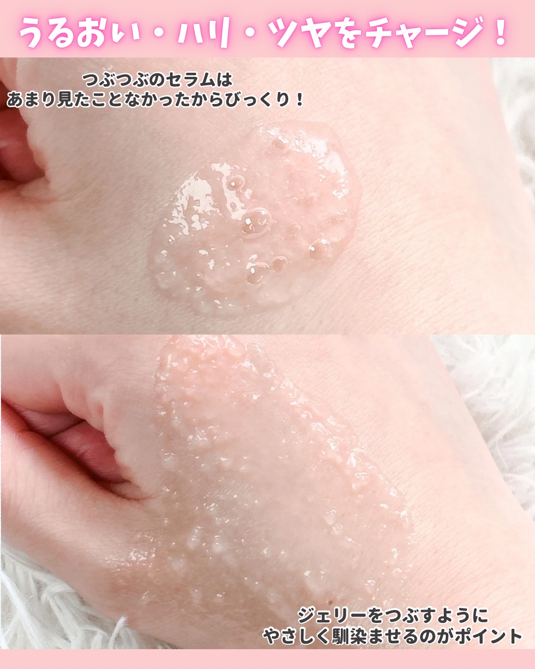 - ぷるんと弾けるピンクジェリーが、肌の角質層までうるおいを届け、ハリと輝きを保つ。 高品質「PDRN※1」×「バクチオール※2」で、ゆらぎにくい、弾むような肌へ。 1.うるおいを届け、弾むような肌に ダマスクローズ由来のPDRN※1 は、肌に寄り添う発想から生まれたもの。肌をいきいきとした印象へと導きながら、肌本来のハリ・弾力を引き出し、なめらかでキメの整った肌へ。 2.未来の自分のために、エイジングケア※5の第一歩として 植物由来のバクチオール※2 とNMN※6 が、肌本来のバリア機能を高めながら、ハリのある肌へと導きます。敏感な肌にもやさしい、穏やかなエイジングケア※5 が可能です。 3.植物由来成分で、優しくケア 肌に負担をかけにくい、こだわりの植物由来成分を配合。「皮膚低刺激テスト※7」をクリアしているため、敏感肌の方でも安心して日常のケアに取り入れることができます。 4.まるでジェリーな新感覚テクスチャー ぷるんとしたみずみずしいテクスチャーにより、べたつかず肌の角質層まで浸透※8。機能性だけでなく使い心地にも優れた、新感覚美容液となっています。 ※1) DNA-Na(整肌成分) ※2) 整肌成分 ※5) エイジングケアとは年齢に応じたお手入れのこと ※6) ニコチンアミドモノヌクレオチド(整肌成分) 2025年5月9日(金)よりQoo10にて先行発売