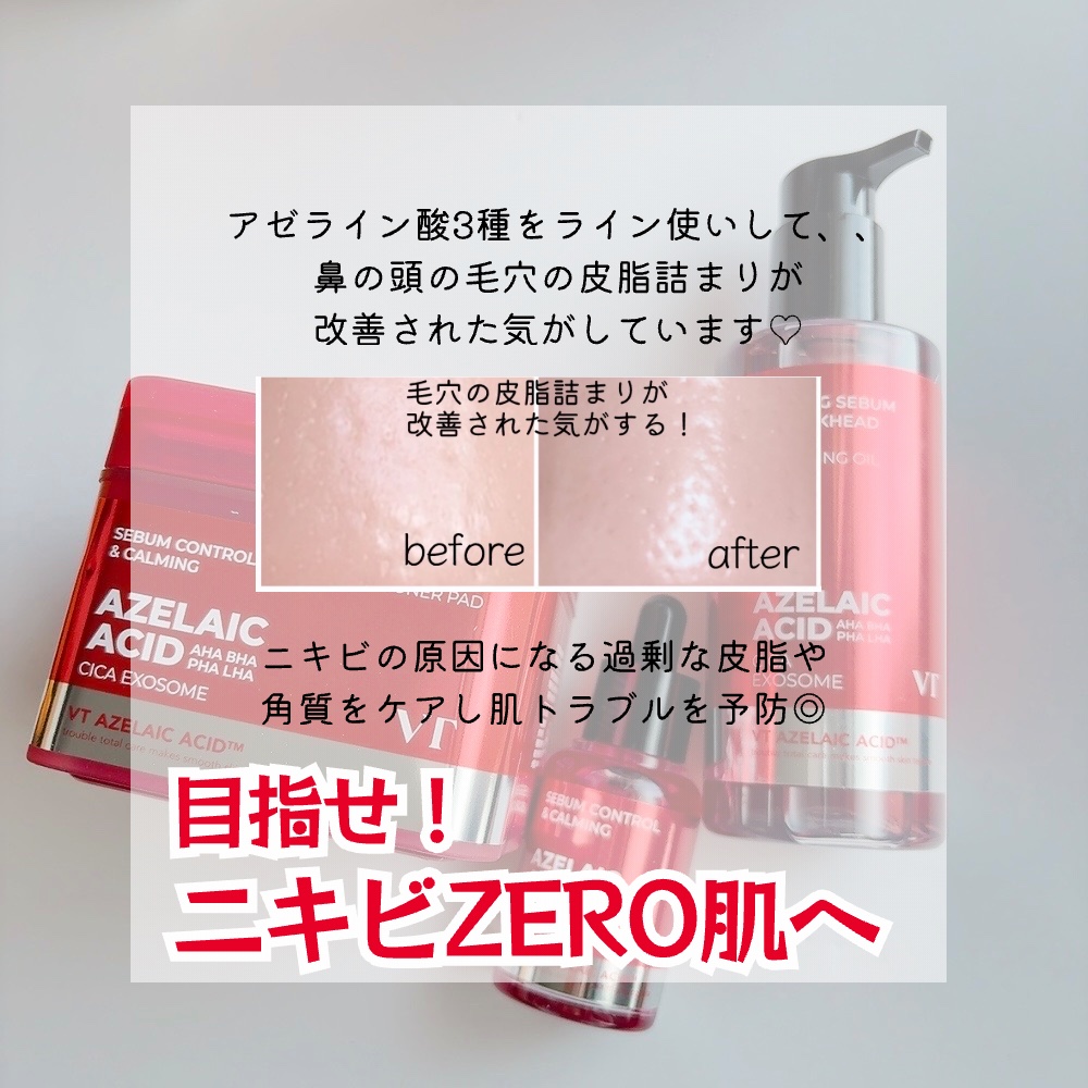 VTアゼライン酸三種の神器使いました❤️アゼライン酸クレンジングオイルサラサラなテクスチャーで脂性肌でも負担なしお水のような、サラッとしたテクスチャ。でもメイクとなじませるとトロッとした感触になり、垂れずにお肌に負担をかけずにメイクが浮いて...