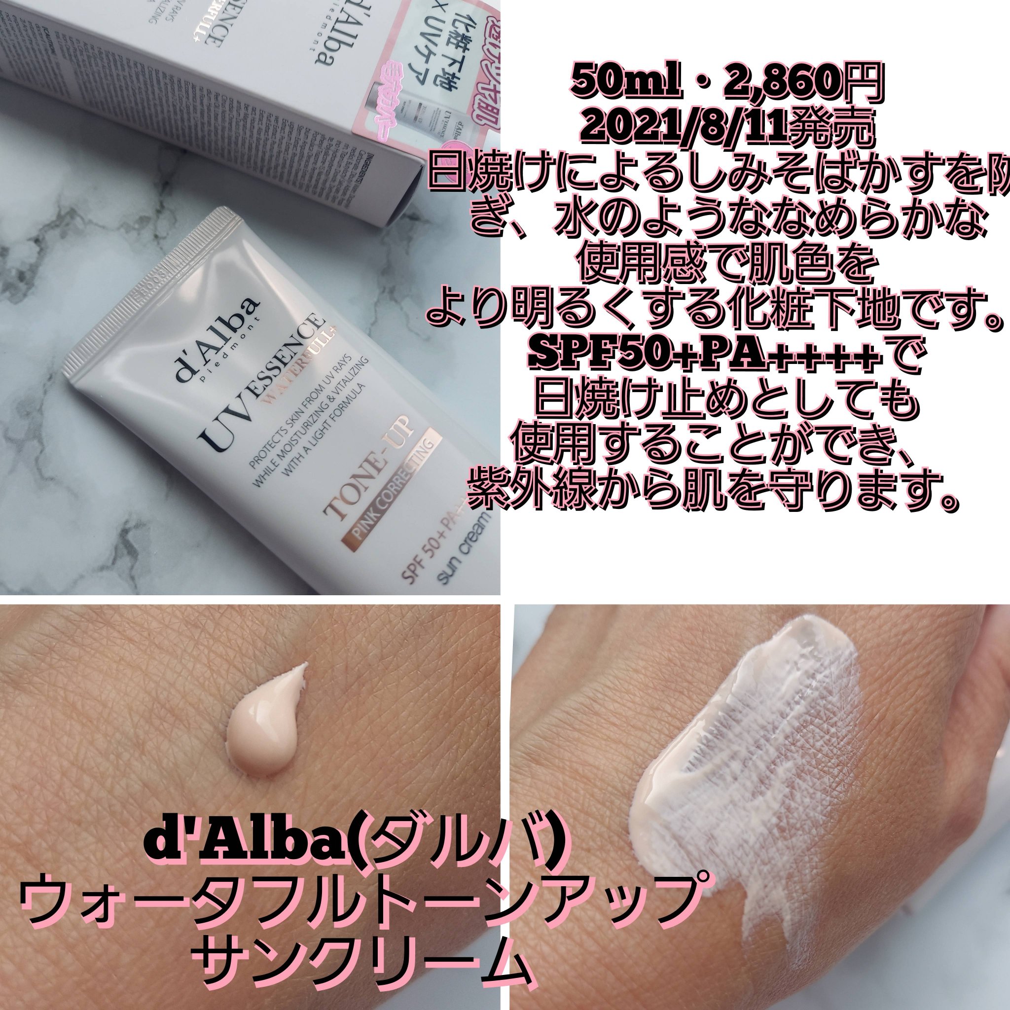 つやんとした肌に仕上がる下地🌿SPFも高いので、日焼け止め効果もバッチリ🌞ダルバ🌿ウォータフルトーンアップサンクリーム香りも好き🩷SPF50+・PA++++日焼けによるしみ、そばかすを防ぎ水のようななめらかな使用感で肌色をより明るくする化粧下...