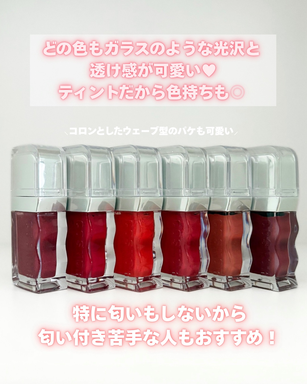 - <01 ソフィー(Surfy)> リンゴ酸ジイソステアリル、ジフェニルシロキシフェニルトリメチコン、精製水、ジフェニルジメチコン、ビスジグリセリルポリアシルアジペート-2、水添ポリイソブテン、ポリグリセリン-3、ポリソルベート60、セチルPEG/PPG-10/1ダイメチコン、イソステアリン酸ソルビタン、BG、ペンチレングリコール、1,2-ヘキサンジオール、ダイメジメチコン、アクリル酸ヒドロキシエチル/ナトリウムアクリロイルジメチルタウリン酸共重合体スクアラン、セテアレス-20、二酸化チタン、エチルヘキシルグリセリン、赤色227号、黄色5 号、香料、赤色104号(1)、水酸化酸化アルミニウム、ポリアクリル酸アンモニウム溶液、黄色4号、フェノキシエタノール、マカデミア種子油、ローズヒップ油、ツバキ油、トコフェロール <02 ピンクラッシュ(Pinkrush)> リンゴ酸ジイソステアリル、ジフェニルシロキシフェニルトリメチコン、精製水、ビスジグリセリルポリアシルアジペート-2、ジフェニルジメチコン、水添ポリイソブテン、ポリグリセリン-3、ポリソルベート60、セチルPEG/PPG-10/1ダイメチコン、イソステアリン酸ソルビタン、BG、ダイメジメチコン、ペンチレングリコール、1,2-ヘキサンジオール、アクリル酸ヒドロキシエチル/ナトリウムアクリロイルジメチルタウリン酸共重合体スクアラン、セテアレス-20、二酸化チタン、エチルヘキシルグリセリン、赤色227号、黄色5 号、香料、水酸化酸化アルミニウム、ポリアクリル酸アンモニウム溶液、フェノキシエタノール、マカデミア種子油、ローズヒップ油、ツバキ油、トコフェロール <03 グレア(Glare) > リンゴ酸ジイソステアリル、ジフェニルシロキシフェニルトリメチコン、精製水、ビスジグリセリルポリアシルアジペート-2、ジフェニルジメチコン、水添ポリイソブテン、ポリグリセリン-3、ポリソルベート60、セチルPEG/PPG-10/1ダイメチコン、イソステアリン酸ソルビタン、BG、ペンチレングリコール、1,2-ヘキサンジオール、ダイメジメチコン、アクリル酸ヒドロキシエチル/ナトリウムアクリロイルジメチルタウリン酸共重合体スクアラン、セテアレス-20、二酸化チタン、エチルヘキシルグリセリン、黄色5 号、香料、赤色104号(1)、赤色227号、水酸化酸化アルミニウム、ポリアクリル酸アンモニウム溶液、黄色4号、フェノキシエタノール、ブリリアントブルーFCF、マカデミア種子油、ローズヒップ油、ツバキ油、トコフェロール <04 ウィッティー(Witty)> リンゴ酸ジイソステアリル、ジフェニルシロキシフェニルトリメチコン、精製水、ビスジグリセリルポリアシルアジペート-2、ジフェニルジメチコン、水添ポリイソブテン、ポリグリセリン-3、ポリソルベート60、セチルPEG/PPG-10/1ダイメチコン、イソステアリン酸ソルビタン、BG、ダイメジメチコン、ペンチレングリコール、1,2-ヘキサンジオール、アクリル酸ヒドロキシエチル/ナトリウムアクリロイルジメチルタウリン酸共重合体スクアラン、セテアレス-20、二酸化チタン、黄色5 号、赤色227号、エチルヘキシルグリセリン、香料、水酸化酸化アルミニウム、ポリアクリル酸アンモニウム溶液、フェノキシエタノール、マカデミア種子油、ローズヒップ油、ツバキ油、トコフェロール <05 パンチ(Punch)> リンゴ酸ジイソステアリル、ジフェニルシロキシフェニルトリメチコン、精製水、ジフェニルジメチコン、ビスジグリセリルポリアシルアジペート-2、水添ポリイソブテン、ポリグリセリン-3、ポリソルベート60、セチルPEG/PPG-10/1ダイメチコン、イソステアリン酸ソルビタン、BG、ペンチレングリコール、1,2-ヘキサンジオール、ダイメジメチコン、アクリル酸ヒドロキシエチル/ナトリウムアクリロイルジメチルタウリン酸共重合体二酸化チタン、スクアラン、セテアレス-20、黄色5 号、エチルヘキシルグリセリン、香料、赤色227号、赤色104号(1)、水酸化酸化アルミニウム、ポリアクリル酸アンモニウム溶液、フェノキシエタノール、マカデミア種子油、ローズヒップ油、ツバキ油、トコフェロール <06 ディア(Dear)> リンゴ酸ジイソステアリル、ジフェニルシロキシフェニルトリメチコン、精製水、ジフェニルジメチコン、ビスジグリセリルポリアシルアジペート-2、水添ポリイソブテン、ポリグリセリン-3、ポリソルベート60、セチルPEG/PPG-10/1ダイメチコン、イソステアリン酸ソルビタン、BG、ペンチレングリコール、1,2-ヘキサンジオール、ダイメジメチコン、アクリル酸ヒドロキシエチル/ナトリウムアクリロイルジメチルタウリン酸共重合体スクアラン、セテアレス-20、二酸化チタン、エチルヘキシルグリセリン、黄色5 号、赤色227号、香料、水酸化酸化アルミニウム、黄色4号、ポリアクリル酸アンモニウム溶液、フェノキシエタノール、マカデミア種子油、ブリリアントブルーFCF、ローズヒップ油、ツバキ油、トコフェロール <07 カインド(Kind)> リンゴ酸ジイソステアリル、ジフェニルシロキシフェニルトリメチコン、精製水、ジフェニルジメチコン