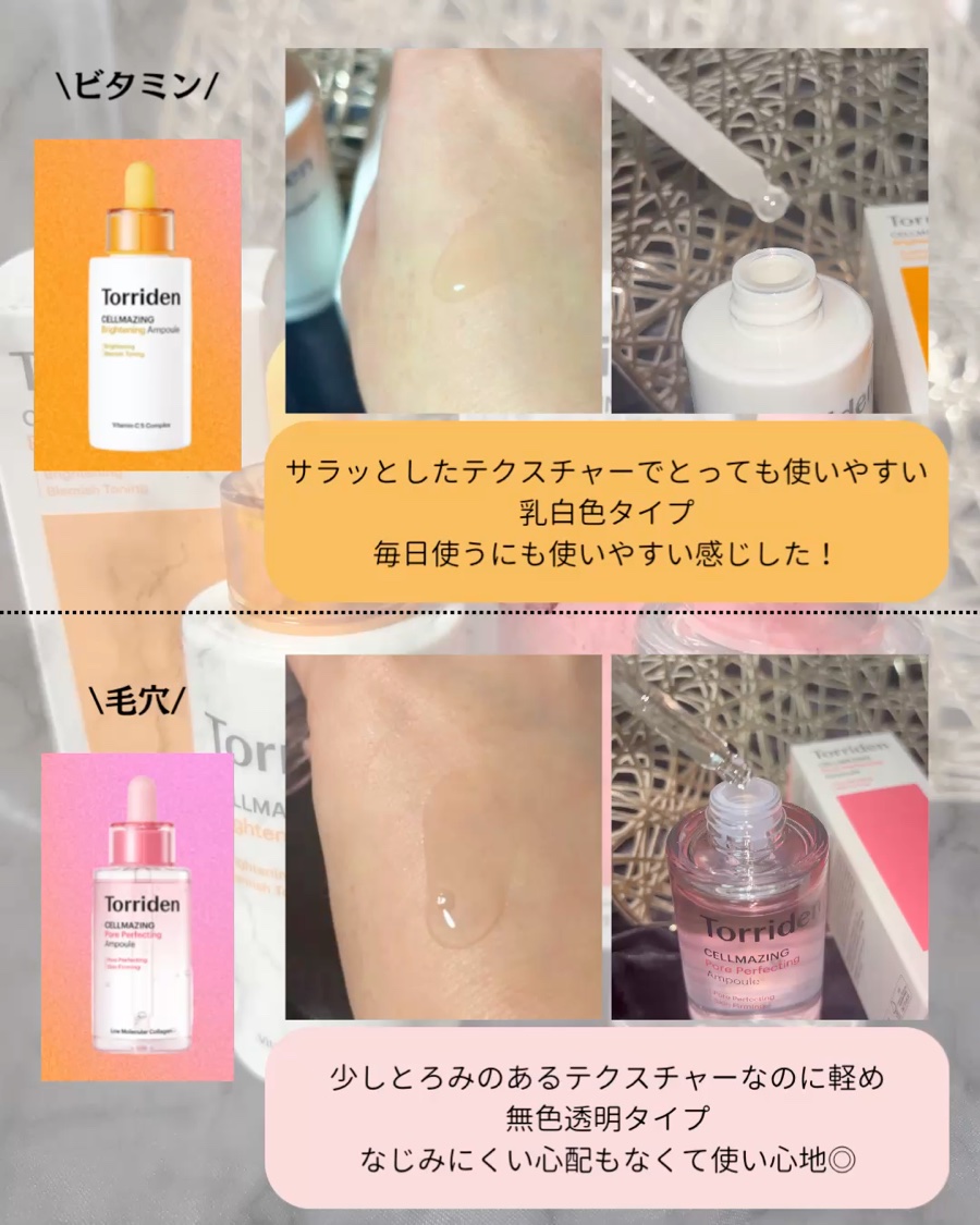 Torriden(トリデン)の人気アンプル2種をレビュー✍️🩷セルメイジングコラーゲンポアパーフェクティングアンプル→毛穴のたるみにアプローチできるアンプル。5Dコラーゲン*¹とヒアルロン酸*¹で、ハリやうるおい*²を補給できる。朝におすすめ...