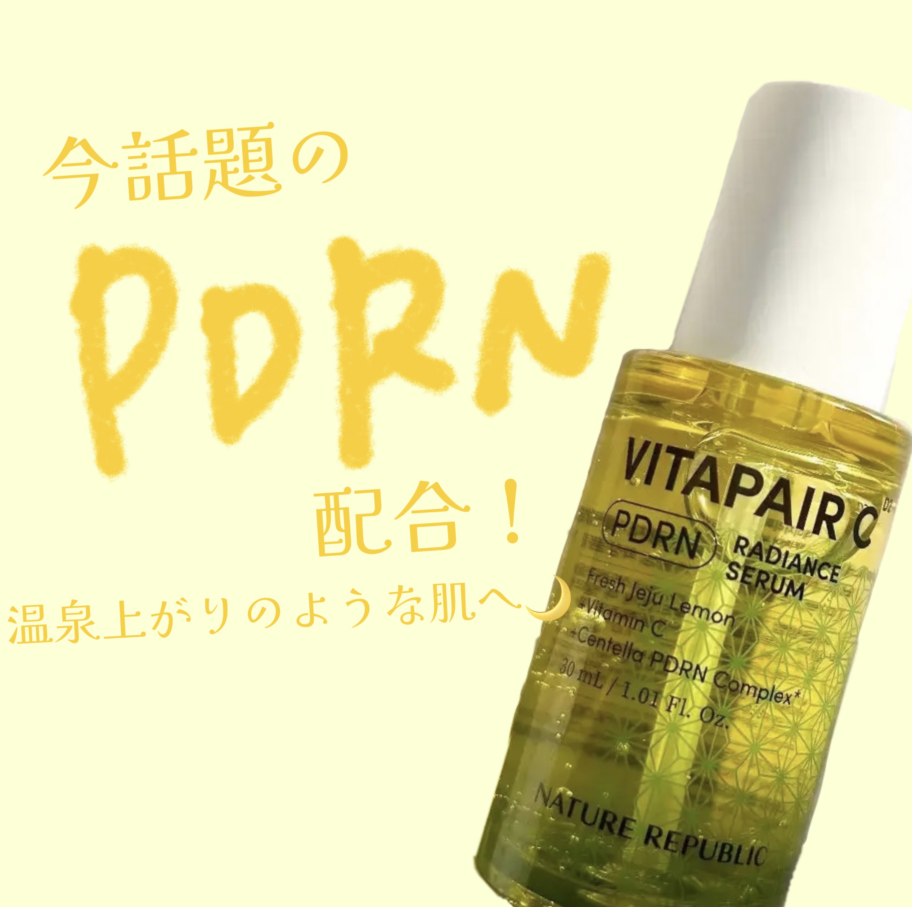 - センテラPDRNとビタミンC成分により敏感肌や荒れたお肌をやさしく鎮静しながら、温泉上がりのような透明感と潤いをプラス。 さらにナイアシンアミドや、済州グリーンレモン水※1でくすみやシミをケアし、健やかな肌へと導きます。 高濃度なスキンケアが苦手な方や敏感肌の方でも毎日使いやすい、デイリーケアにぴったりの低刺激セラムです。 【こんな方におすすめ】 ・お肌のハリや弾力が気になる方 ・敏感肌で高濃度製品を使用することに抵抗がある方 ・毎日続けられて着実にお肌の潤いと弾力ケアができる商品を探している方