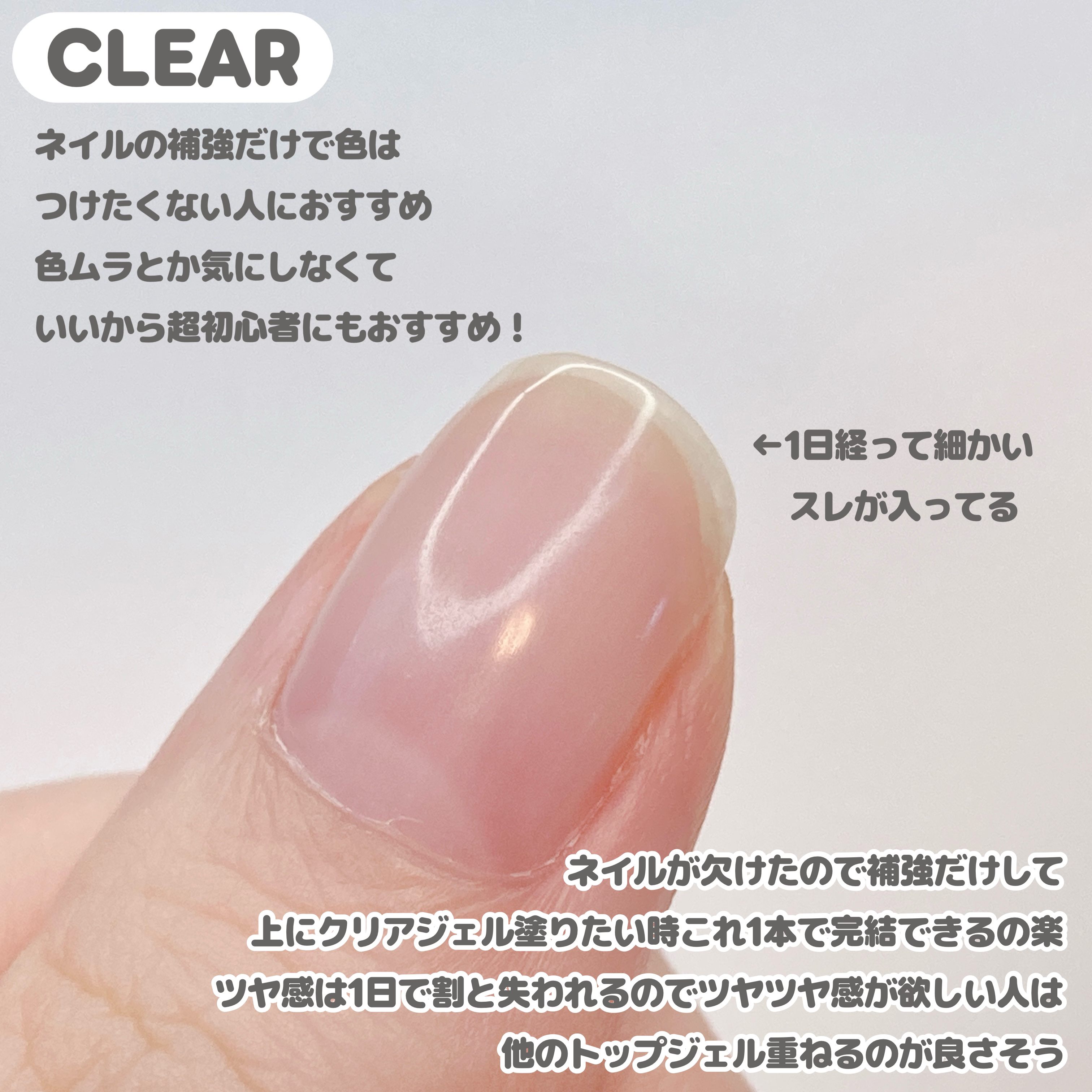 ローズブラウンだけこの中だとすこし透明感が低い色 落ち着いたカラーで使いやすいです 他2つはクリア度が高い色ですベースカラーが透明のままだと 自爪の色が透けてもっとピンクぽさが強く出ます ベース:セリア ピールオフベース トップ:ネイルタウン irogel グロッシートップ (ノンワイプトップ)