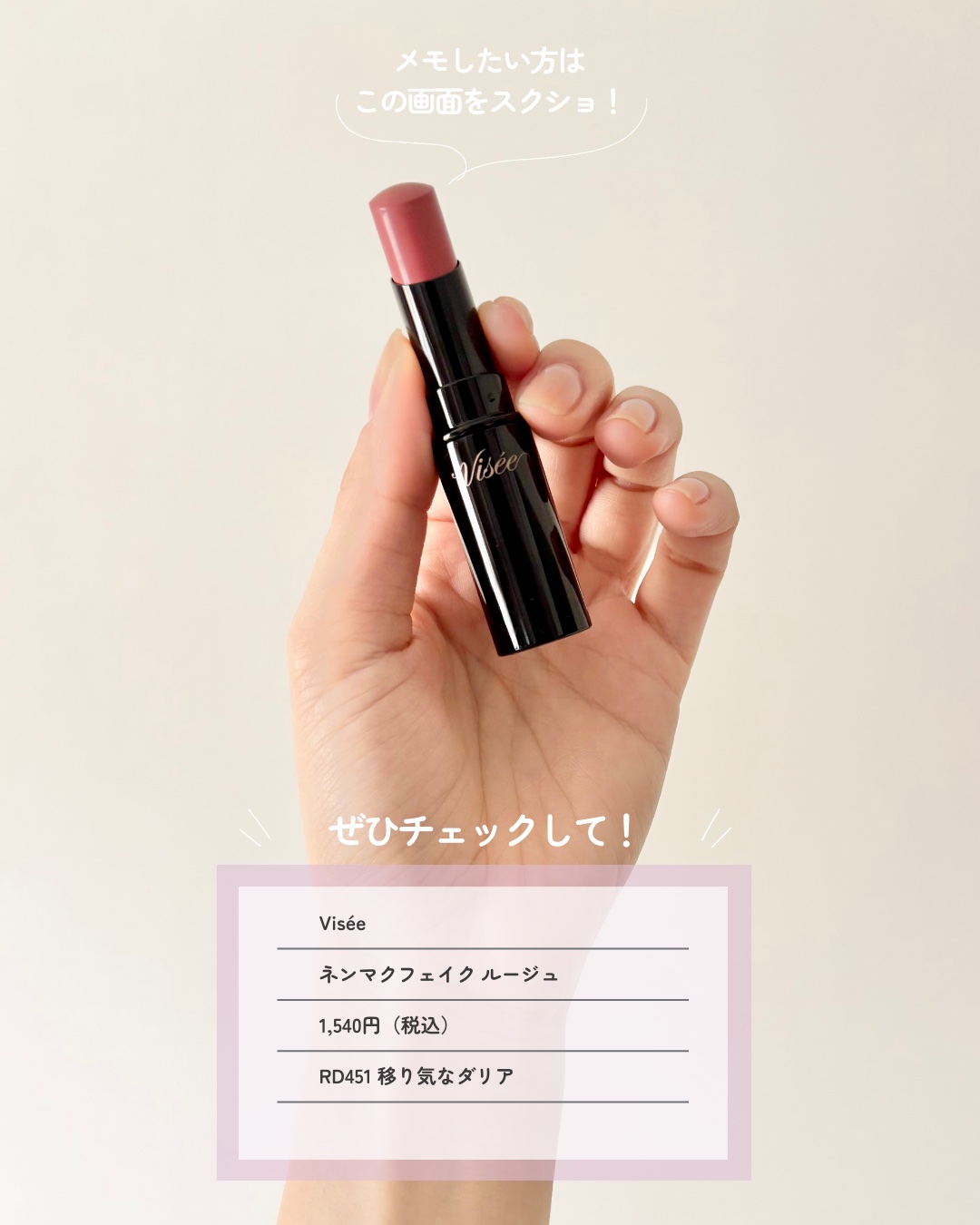 ヴィセの大人気むっちりルージュに夏の限定カラーが仲間入り!◻️ViséeネンマクフェイクルージュRD451移り気なダリアPK854一途なピオニー各¥1,540(税込)大人気のネンマクフェイクルージュにフレッシュで明るい印象の夏の限定2色が登場...