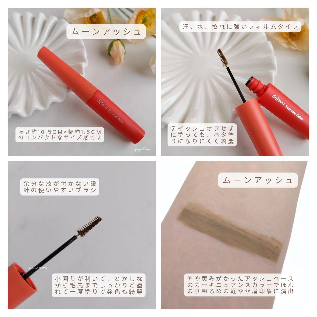 デジャヴュさまからいただきました極細ブラシでふんわり色づくフィルム眉カラーにこの夏限定色が登場!7.11限定発売の109ムーンアッシュ品のあるくすみアッシュで落ち着いた印象に仕上がる少しカーキ感もあってどんなメイクにもハマりやすい気がする!眉...