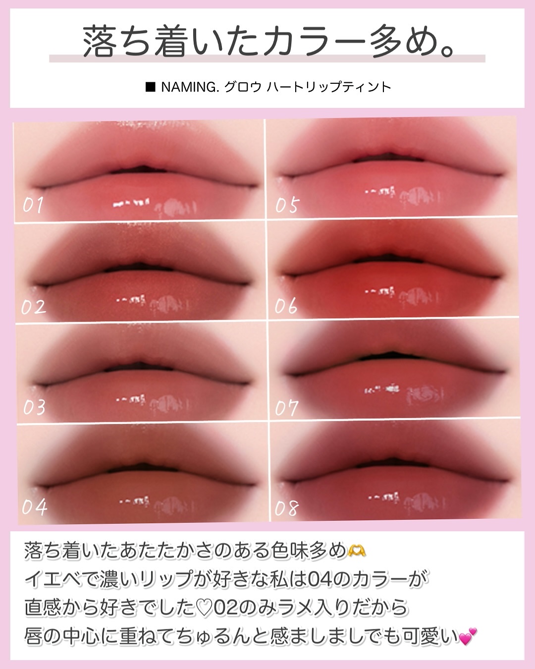 NAMING.のハートリップ❤️🔥パケも可愛いし色味も💕日本限定カラー3色(02.03.08)のうち02を試したよ❤️🔥塗ったら30秒我慢、色が定着しやすくなるからね😍❤️🔥02だけパールいりでほんとにキラキラして可愛いの💕#NAMIN...
