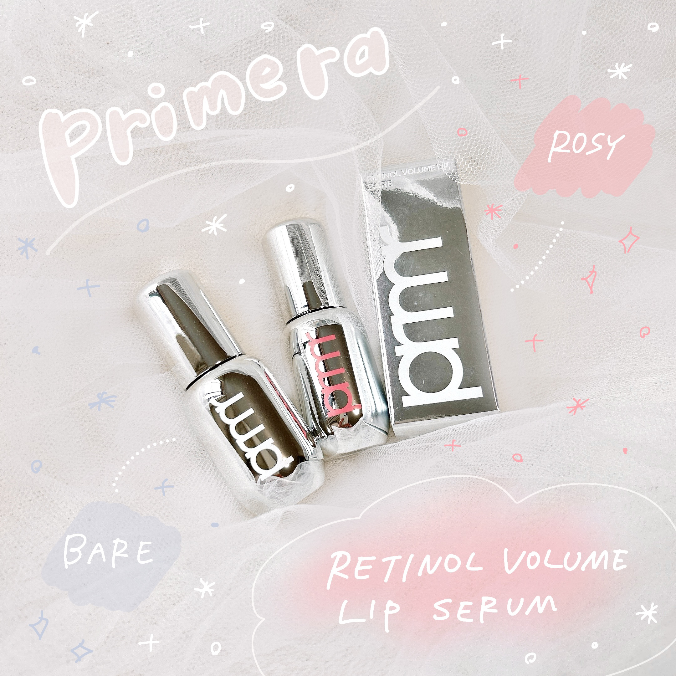 ずっと気になっていたprimeraの「レチノールボリュームリップセラム」!このリップセラムにはレチノール(整肌成分)配合されているので、アラサー以降年々増えてくる口元のお悩みケアが可能。 「ロージー」は肌馴染みのいいミュートピンクなので、すっぴんにつけても浮いて見えず可愛いです!「ベア」はナイトケアにも使いやすいクリアタイプ。 どちらも塗って少しするとほんのり清涼感がありますが、ピリピリするような刺激はありませんでした。