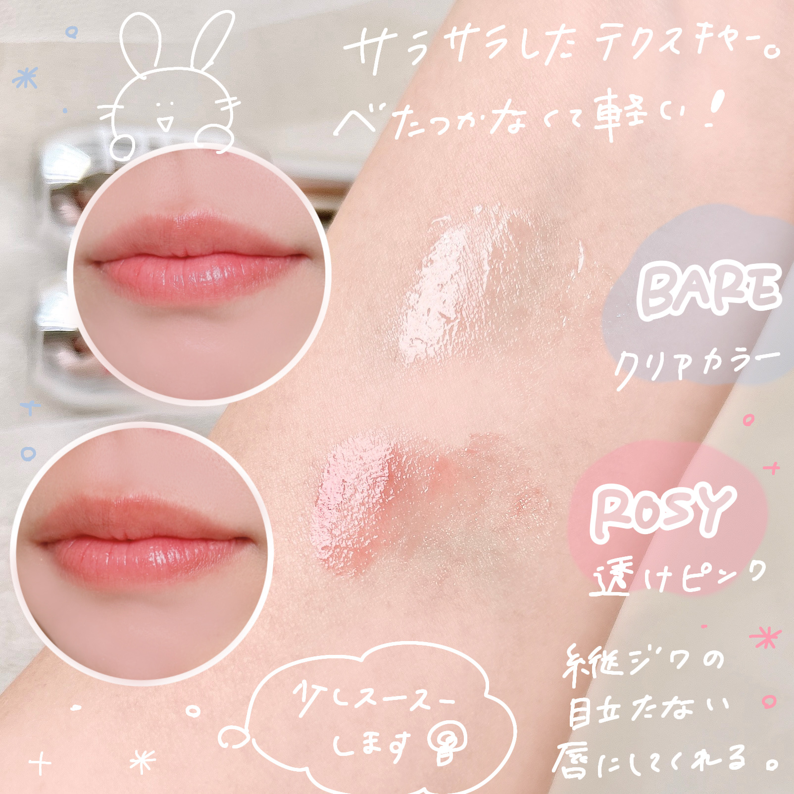 - <ロージー> 水添ポリ(C6-14オレフィン)、水添ポリイソブテン、トリ(カプリル酸/カプリン酸)グリセリル、(エチレン/プロピレン/スチレン)コポリマー、酢酸トコフェロール、ダイズ油、パルマローザ油、ニオイテンジクアオイ花油、ヒマシ油、ホホバ種子油、ローズマリー葉油、ダマスクバラ花油、オレンジ果皮エキス、テトラヘキシルデカン酸アスコルビル、レチノール、セラミドNP、ダイズポリペプチド、乳酸桿菌培養溶解質、加水分解エクステンシン、ヒアルロン酸Na、加水分解ヒアルロン酸、ヒアルロン酸クロスポリマーNa、ヒアルロン酸、アセチルヒアルロン酸Na、エチルヘキシルグリセリン、トリイソステアリン酸ポリグリセリル-2、ラウリン酸ポリグリセリル-10、(ブチレン/エチレン/スチレン)コポリマー、テトラ(ジ-t-ブチルヒドロキシヒドロケイヒ酸)ペンタエリスリチル、水、水酸化Al、トリエトキシカプリリルシラン、グリセリン、プロパンジオール、BG、1,2-ヘキサンジオール、水添レシチン、トコフェロール、メントキシプロパンジオール、マンダリンオレンジ果皮油、ベルガモット果実油、パチョリ油、カミツレ花油、ラベンダー油、酸化チタン、酸化鉄、赤201、赤202 <ベア> 水添ポリ(C6-14オレフィン)、水添ポリイソブテン、トリ(カプリル酸/カプリン酸)グリセリル、(エチレン/プロピレン/スチレン)コポリマー、酢酸トコフェロール、ヒマワリ種子油、ダイズ油、パルマローザ油、ニオイテンジクアオイ花油、ヒマシ油、ローズマリー葉油、ホホバ種子油、ダマスクバラ花油、ニンジン根エキス、オレンジ果皮エキス、レチノール、β-カロチン、セラミドNP、ダイズポリペプチド、乳酸桿菌培養溶解質、ヒアルロン酸Na、加水分解エクステンシン、ラウリン酸ポリグリセリル-10、ヒアルロン酸クロスポリマーNa、加水分解ヒアルロン酸、ヒアルロン酸、アセチルヒアルロン酸Na、テトラヘキシルデカン酸アスコルビル、エチルヘキシルグリセリン、(ブチレン/エチレン/スチレン)コポリマー、グリセリン、BG、水、プロパンジオール、1,2-ヘキサンジオール、トコフェロール、テトラ(ジ-t-ブチルヒドロキシヒドロケイヒ酸)ペンタエリスリチル、水添レシチン、メントキシプロパンジオール、マンダリンオレンジ果皮油、ベルガモット果実油、パチョリ油、カミツレ花油、ラベンダー油 <スカイコーラル> 水添ポリ(C6-14オレフィン)、水添ポリイソブテン、トリ(カプリル酸/カプリン酸)グリセリル、(エチレン/プロピレン/スチレン)コポリマー、酢酸トコフェロール、ダイズ油、パルマローザ油、ニオイテンジクアオイ花油、ヒマシ油、ホホバ種子油、ローズマリー葉油、ダマスクバラ花油、オレンジ果皮エキス、テトラヘキシルデカン酸アスコルビル、レチノール、セラミドNP、ダイズポリペプチド、乳酸桿菌培養溶解質、加水分解エクステンシン、ヒアルロン酸Na、加水分解ヒアルロン酸、ヒアルロン酸クロスポリマーNa、ヒアルロン酸、アセチルヒアルロン酸Na、エチルヘキシルグリセリン、トリイソステアリン酸ポリグリセリル-2、ラウリン酸ポリグリセリル-10、(ブチレン/エチレン/スチレン)コポリマー、テトラ(ジ-t-ブチルヒドロキシヒドロケイヒ酸)ペンタエリスリチル、水、グリセリン、プロパンジオール、BG、1,2-ヘキサンジオール、水添レシチン、トコフェロール、メントキシプロパンジオール、マンダリンオレンジ果皮油、ベルガモット果実油、パチョリ油、カミツレ花油、ラベンダー油、酸化チタン、酸化鉄、赤226、黄5 <シャイレッド> 水添ポリ(C6-14オレフィン)、水添ポリイソブテン、トリ(カプリル酸/カプリン酸)グリセリル、(エチレン/プロピレン/スチレン)コポリマー、酢酸トコフェロール、ダイズ油、パルマローザ油、ニオイテンジクアオイ花油、ヒマシ油、ホホバ種子油、ローズマリー葉油、ダマスクバラ花油、オレンジ果皮エキス、テトラヘキシルデカン酸アスコルビル、レチノール、セラミドNP、ダイズポリペプチド、乳酸桿菌培養溶解質、加水分解エクステンシン、ヒアルロン酸Na、加水分解ヒアルロン酸、ヒアルロン酸クロスポリマーNa、ヒアルロン酸、アセチルヒアルロン酸Na、エチルヘキシルグリセリン、トリイソステアリン酸ポリグリセリル-2、ラウリン酸ポリグリセリル-10、(ブチレン/エチレン/スチレン)コポリマー、テトラ(ジ-t-ブチルヒドロキシヒドロケイヒ酸)ペンタエリスリチル、水、グリセリン、プロパンジオール、BG、1,2-ヘキサンジオール、水添レシチン、トコフェロール、メントキシプロパンジオール、マンダリンオレンジ果皮油、ベルガモット果実油、パチョリ油、カミツレ花油、ラベンダー油、赤202、黄5