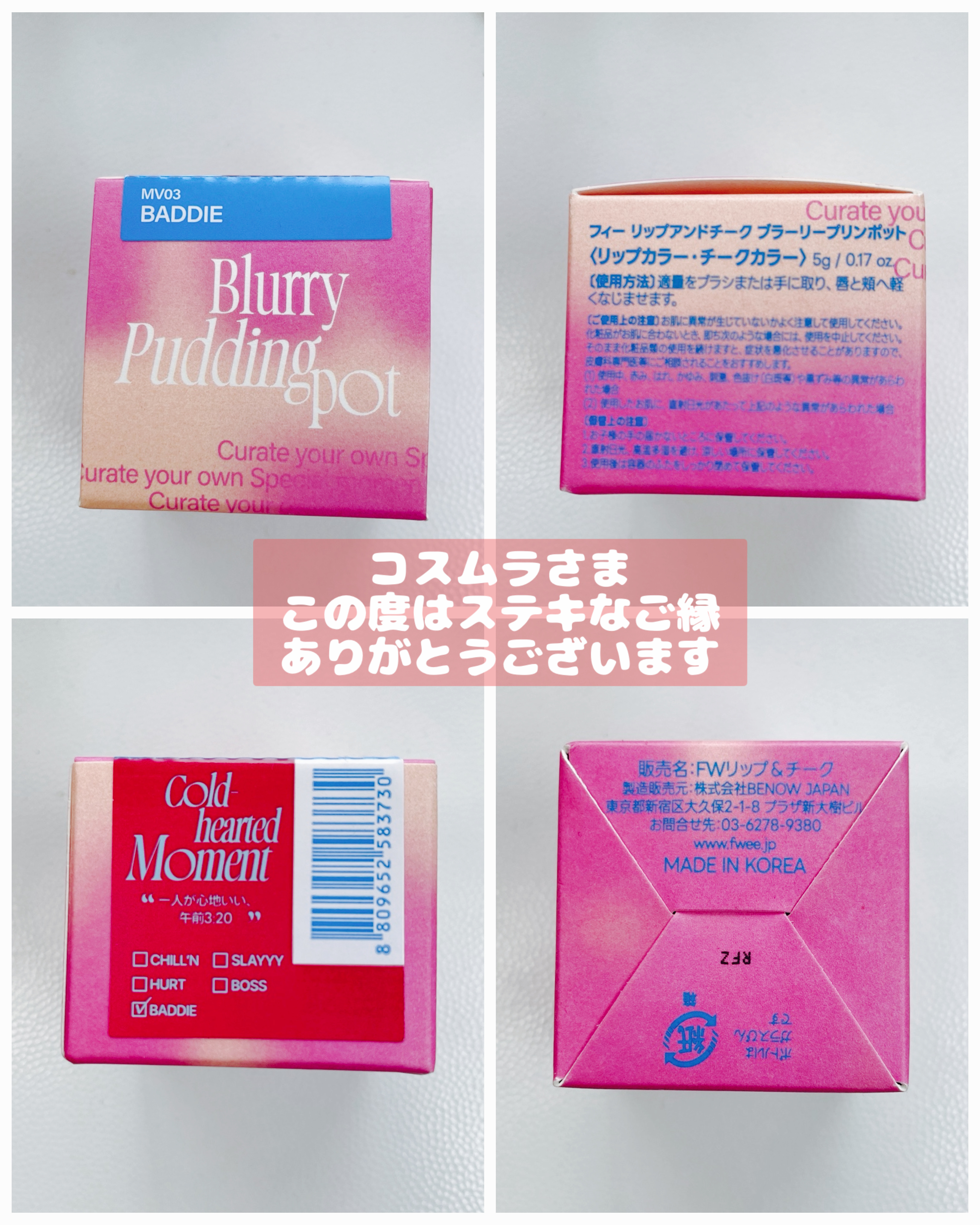 fweeリップアンドチークブラーリープリンポットMV03BADDIEBS05WAVY一人一個は持ってそうな勢いの、fweeプリンポット🍮🫖どちらもブルベカラーをセレクト、似て非なる色合い✨WAVYはイエベでもブルベでも関係なく使えそうかな?B...