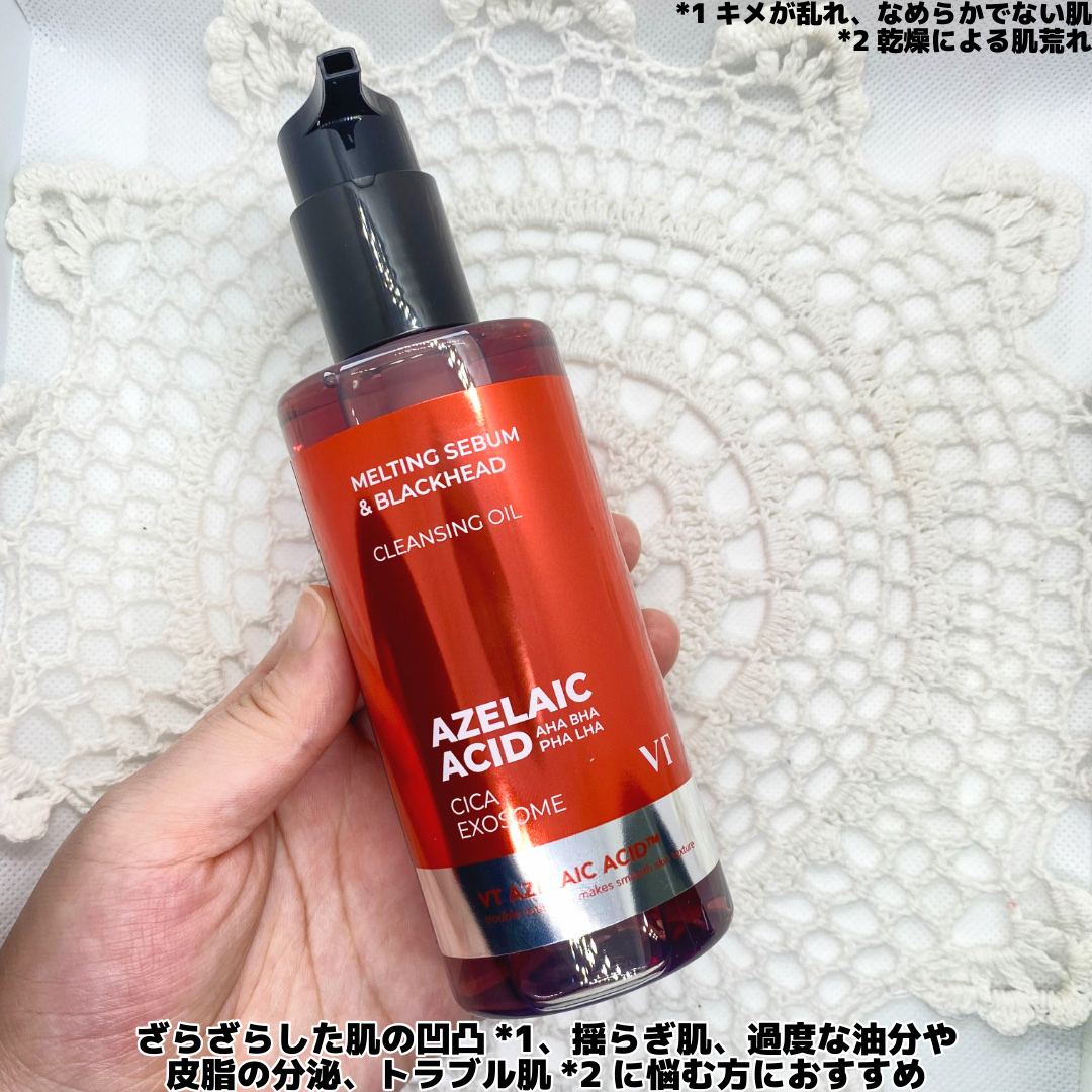 - 最近話題の毛穴ケア・整肌成分アゼライン酸!VTからはクレンジングオイルが登場! ポイントメイクまで落とすしっかりした洗浄力で、毛穴・皮脂までケアし保湿まで叶える一石三鳥アゼライン酸クレンジングオイル。 19種の植物性オイル*1も配合で、目に見えるブラッドヘッド*2から、隠れているホワイトヘッド*2、皮脂まですっきりケアします! ダブル洗顔不要! ※パッケージリニューアル ■このような方へおすすめ メイク・毛穴までディープクレンジング求める方 クレンジングでスキンケアまで行いたい方 ツッパリ感の少ないクレンジングを探していた方 ブラックヘッド*ケアも行いたい方 *1ダイズ油、アルガニアスピノサ核油、ユズ果実油、コメヌカ油、オタネニンジン種子油、アーモンド油、ザクロ種子油、リンゴ種子油、ホホバ種子油、ツバキ種子油、、バオバブ種子油、ユチャ種子油、ベニバナ種子油、ヒマワリ種子油、ヒポファエラムノイデス油、オリーブ果実油、アボカド油、アンズ核油、クロフサスグリ種子油(いずれも保湿) *2古い角質による