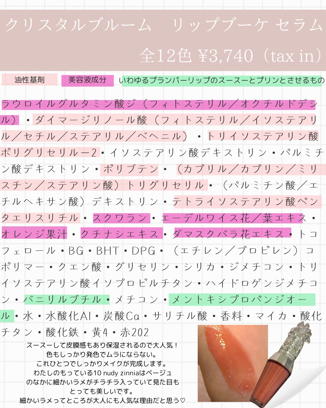 | 口紅・グロス・リップライナーランキング第4位 | ぎっしりラメだけど大粒ではなく、流石デパコスの繊細なチラチラ感なので単色塗りでも、重ねて塗っても上品な仕上がりでとても可愛いプランパーとなっています | 詳細を見る | |