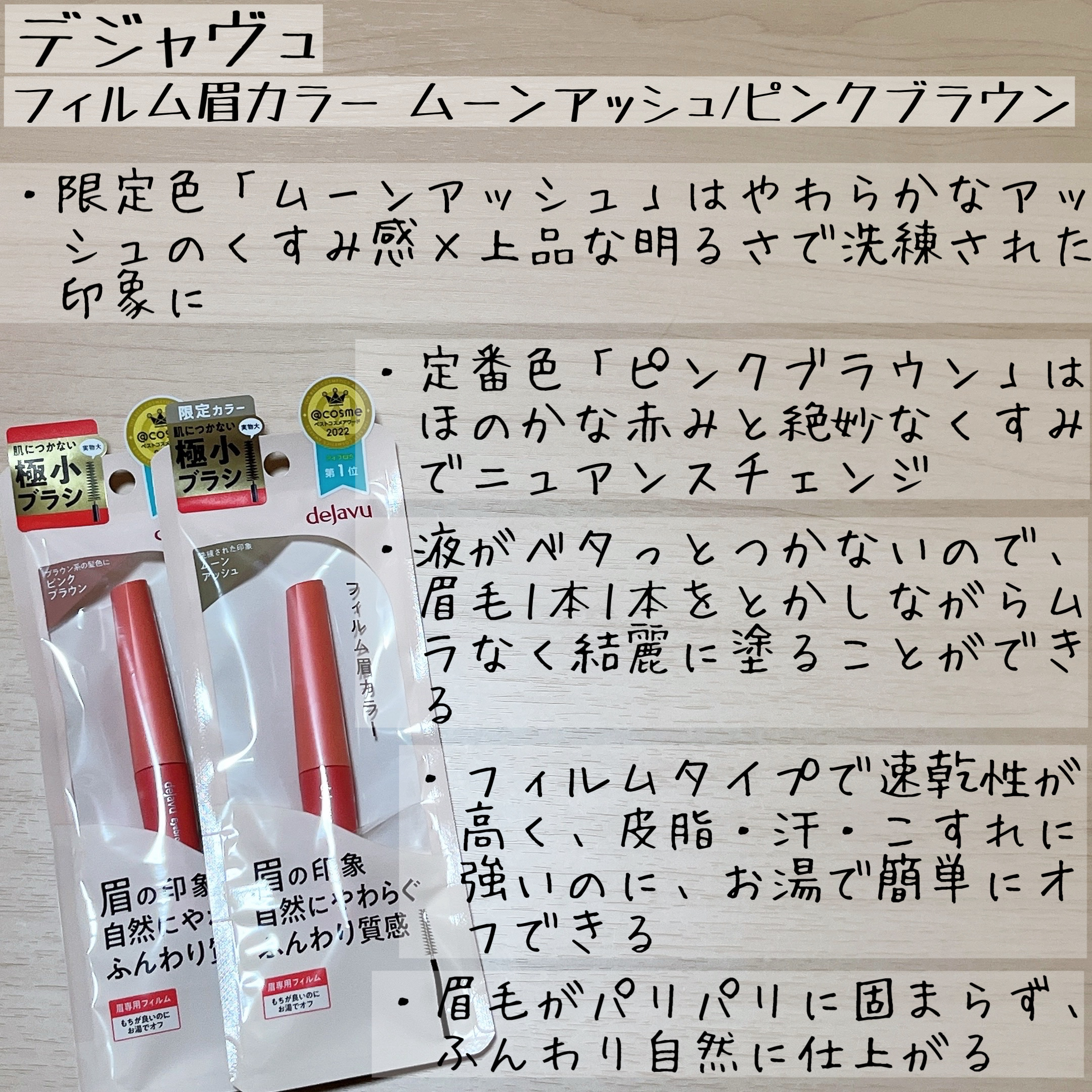 デジャヴュさまからいただきました。デジャヴュフィルム眉カラー\眉毛1本1本色づき自然なふんわり眉✨/極小ブラシだから液が地肌に付きにくい!ボテっと付かずになめらかに密着します。皮脂や汗、こすれに強く、美しい仕上がりが1日続くのに、お湯だけで簡...