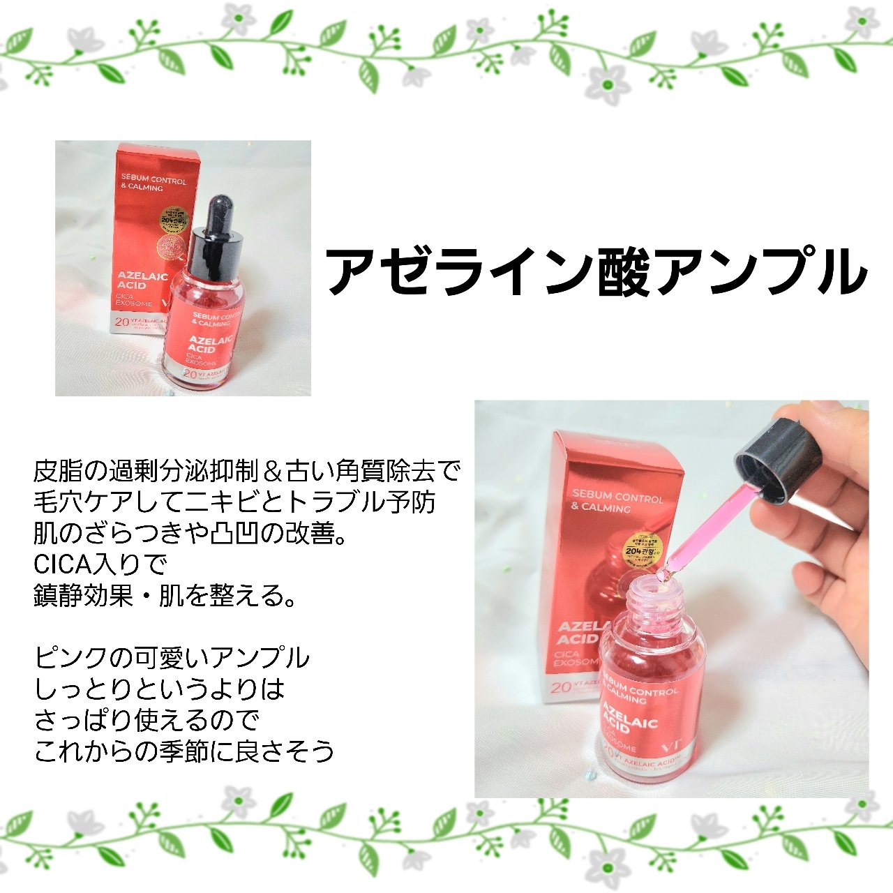 VT様よりアゼライン酸クレンジングオイル、アゼライン酸トナーパット、アゼライン酸アンプルをご提供いただきました。【アゼライン酸クレンジングオイル】サラッとしたテクスチャーでウォータープルーフタイプのメイクも落とせるくらい洗浄力が高めです。洗い...