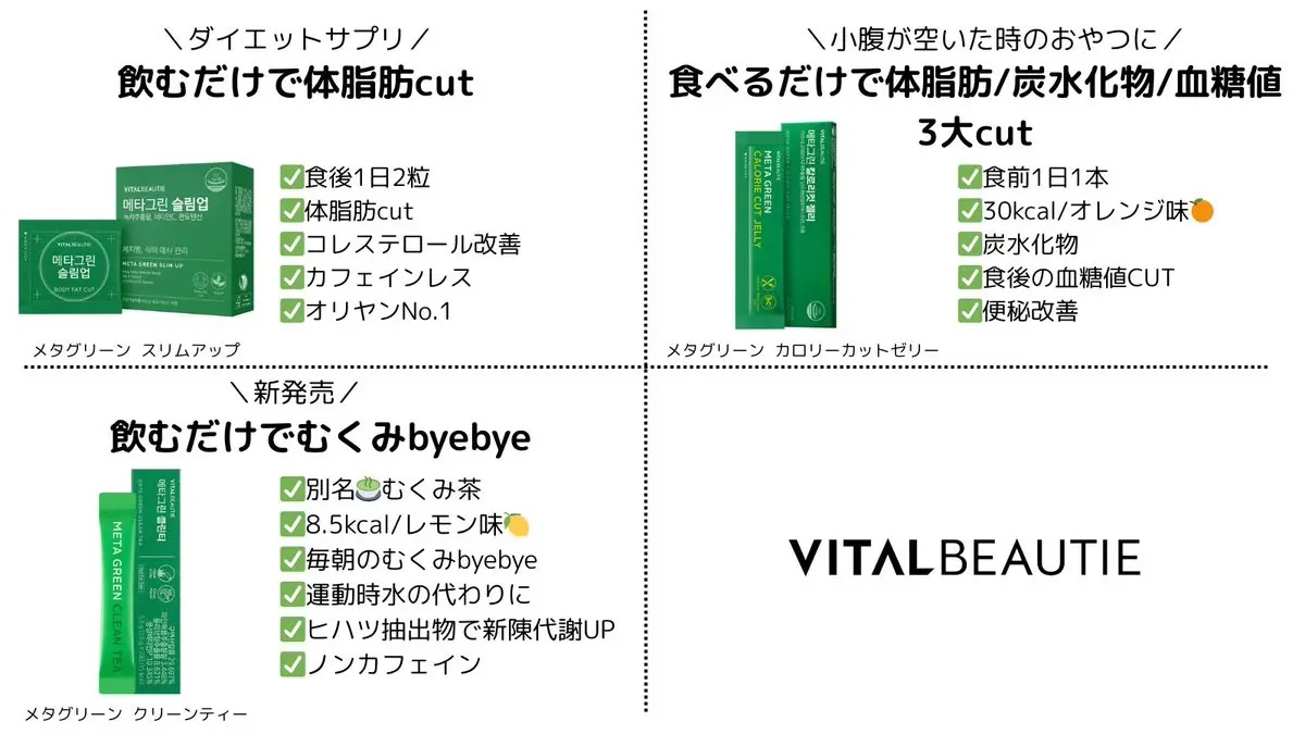 #PR#バイタルビューティー@amorepacific_jpモニターイベントで頂きました😊バイタルビューティーメタグリーンライン💚メタグリーンスリムアップ💚メタグリーンカロリーカットゼリー💚新発売✨メタグリーンクリーンティー💚詳しい内容は画像...