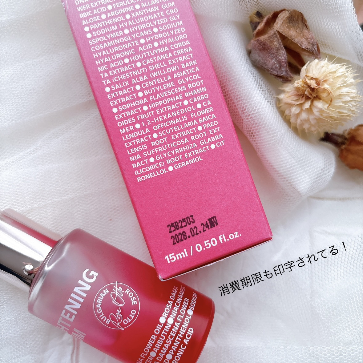 - 貴重なブルガリアンローズオイル*配合の美容液。ブルガリアンローズオイル*に、ダマスクバラ花水*、アルブチン*、多数の植物エキス*を配合することで、透き通るような透明感のある肌印象へ導きます。 韓国とイギリスのヴィーガン認証機関からヴィーガン認証を取得済み。動物原料配合や動物実験などはしていないヴィーガン美容液です。 3000本の中からたった1mLしか抽出できない、貴重なブルガリアンローズオイルに、ダマスクバラ花水、アルブチン等、多数の植物エキスを配合することで、みずみずしく透き通るような肌へ導きます。 *保湿成分