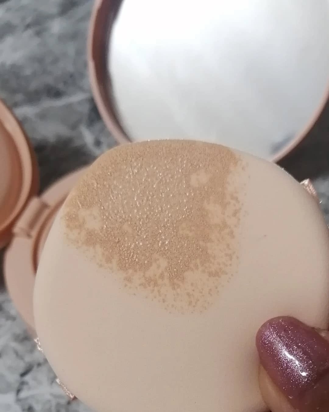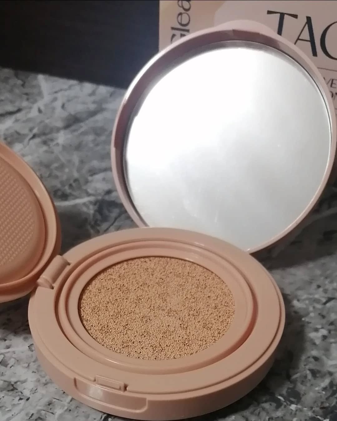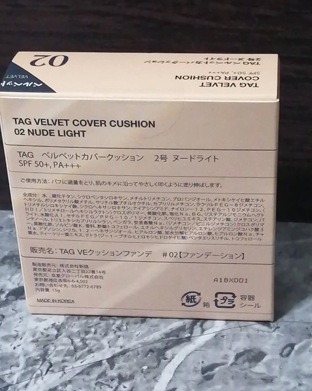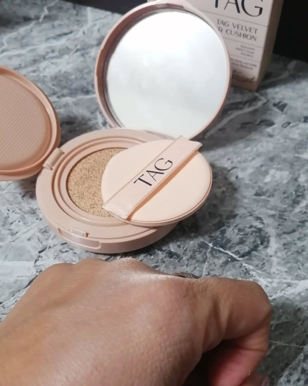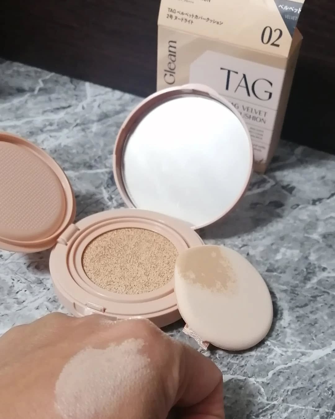 TAGベルベットカバークッション!やわらかな発色の1号と深みのある発色の2号があり、用途や好みによって使い分けが可能で、1号は鼻筋や目の周りに、2号は輪郭やヘアラインに最適らしく、わたしは2号をお試ししてみました。パフにかなりしっかりファンデ...