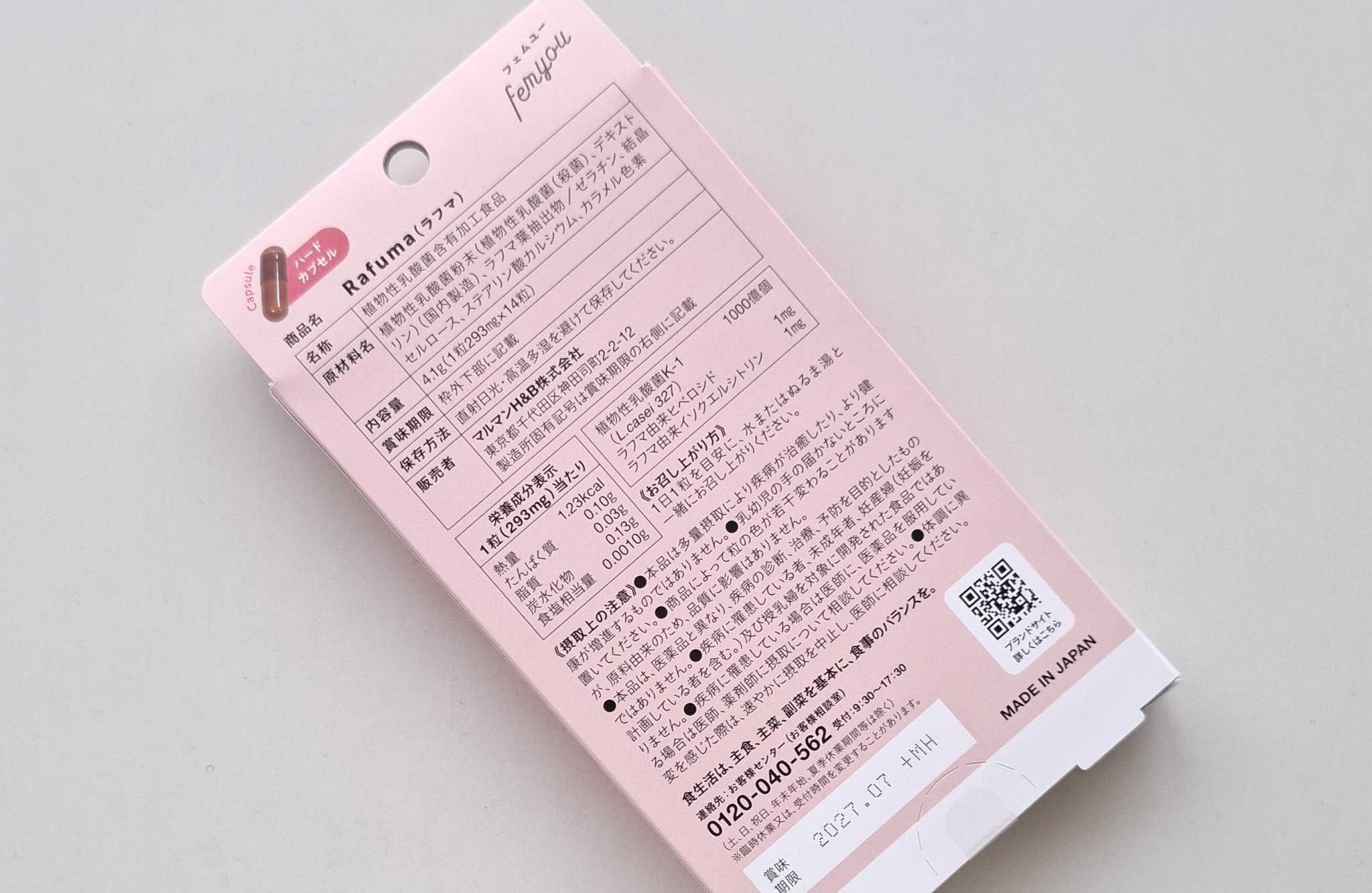 - 【女性のリズムに寄り添う成分】 ・ラフマ葉抽出物 古くから伝統的な医療やハーブ療法に用いられてきた植物由来成分です。 ・乳酸菌K-1 腸内環境を支えるお米由来の乳酸菌です。
