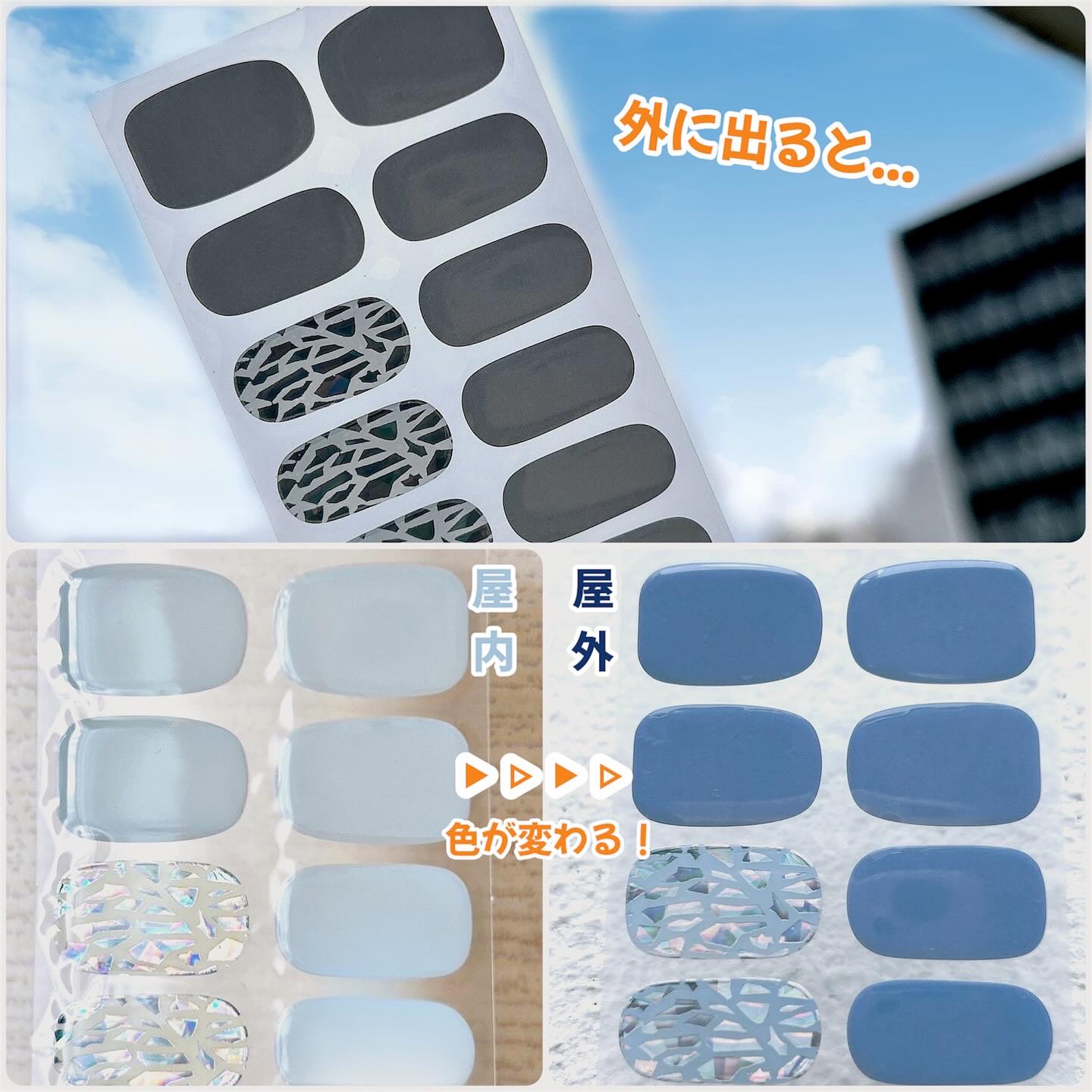 太陽の光でカラーが変わるジェルネイルシール。屋内・屋外、紫外線の強さにより様々なカラー変化が楽しめるこれまでになかったジェルネイルシールです☼ 貼るだけでサロン級の仕上がりですし、UVランプ不要で自然に硬化で簡単すぎる!!!! ほんもののジェルネイルのようなぷっくり感。太陽で色が変わるのが面白い!!
