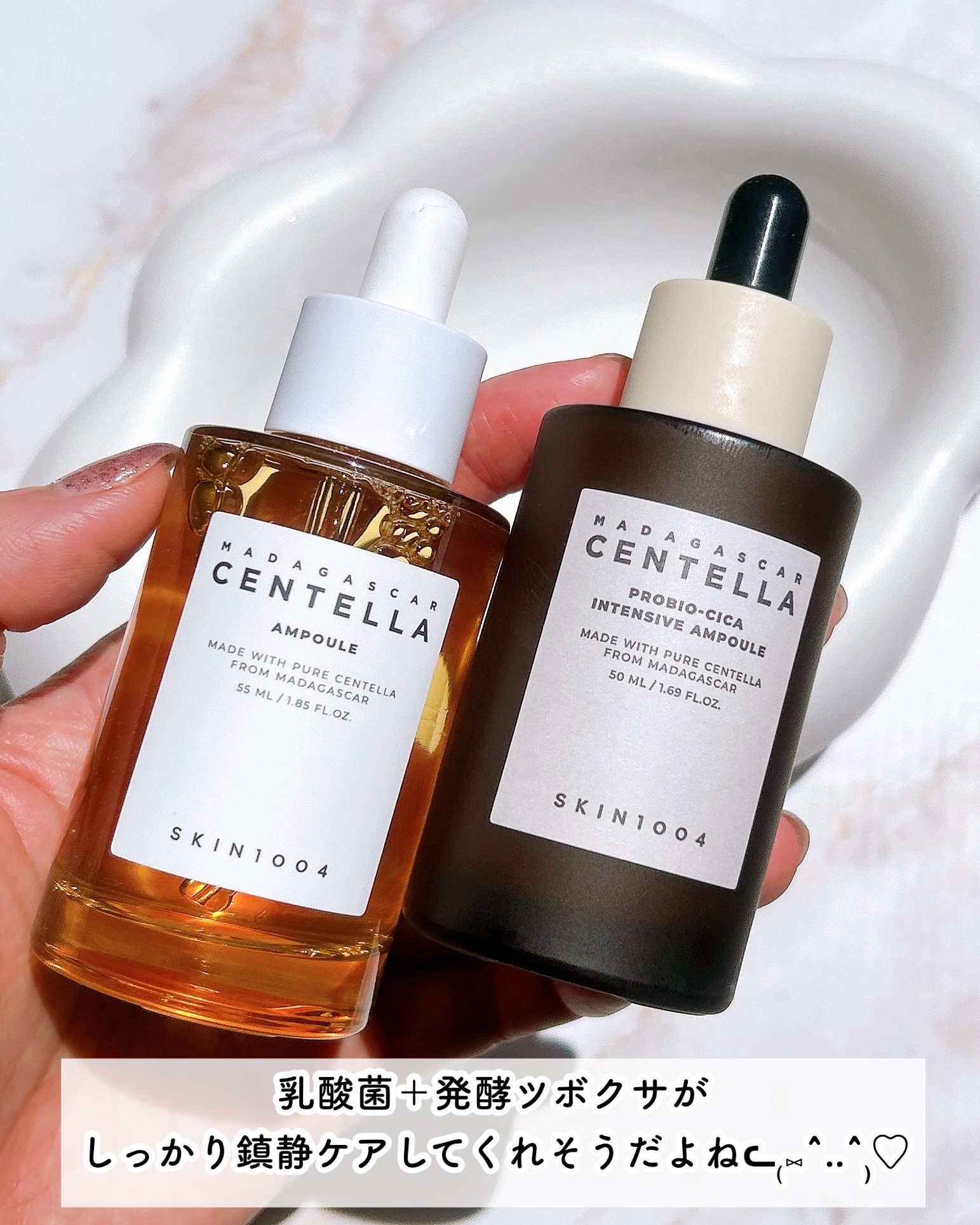 植物性乳酸菌で発酵したセンテラ(ツボクサエキス)で外部刺激でダメージを受けた肌を素早く落ち着かせてくれ さらにシカセラミドで肌バリアをケア! 高濃度のアンプルなので保湿力も高くもっちりとしたテクスチャーなのにベタつきもなく使いやすいのが特徴🤎 プロバイオシカインテンシブアンプルは乾燥しやすい秋冬にぴったり!パッケージも重厚感がありおしゃれ度がマシマシ🤎✨