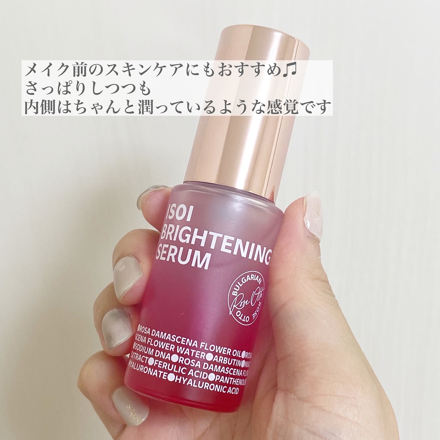 ISOIブライトニングセラム♡韓国で長年人気の「ローズセラム」が、リニューアルされて新登場!ローズPDRN複合成分で、くすみケアがさらにパワーアップ💖リニューアルしてさらに満足度が高くなったよ🌹プッシュタイプで出しやすい!とろっとなめらかで伸...