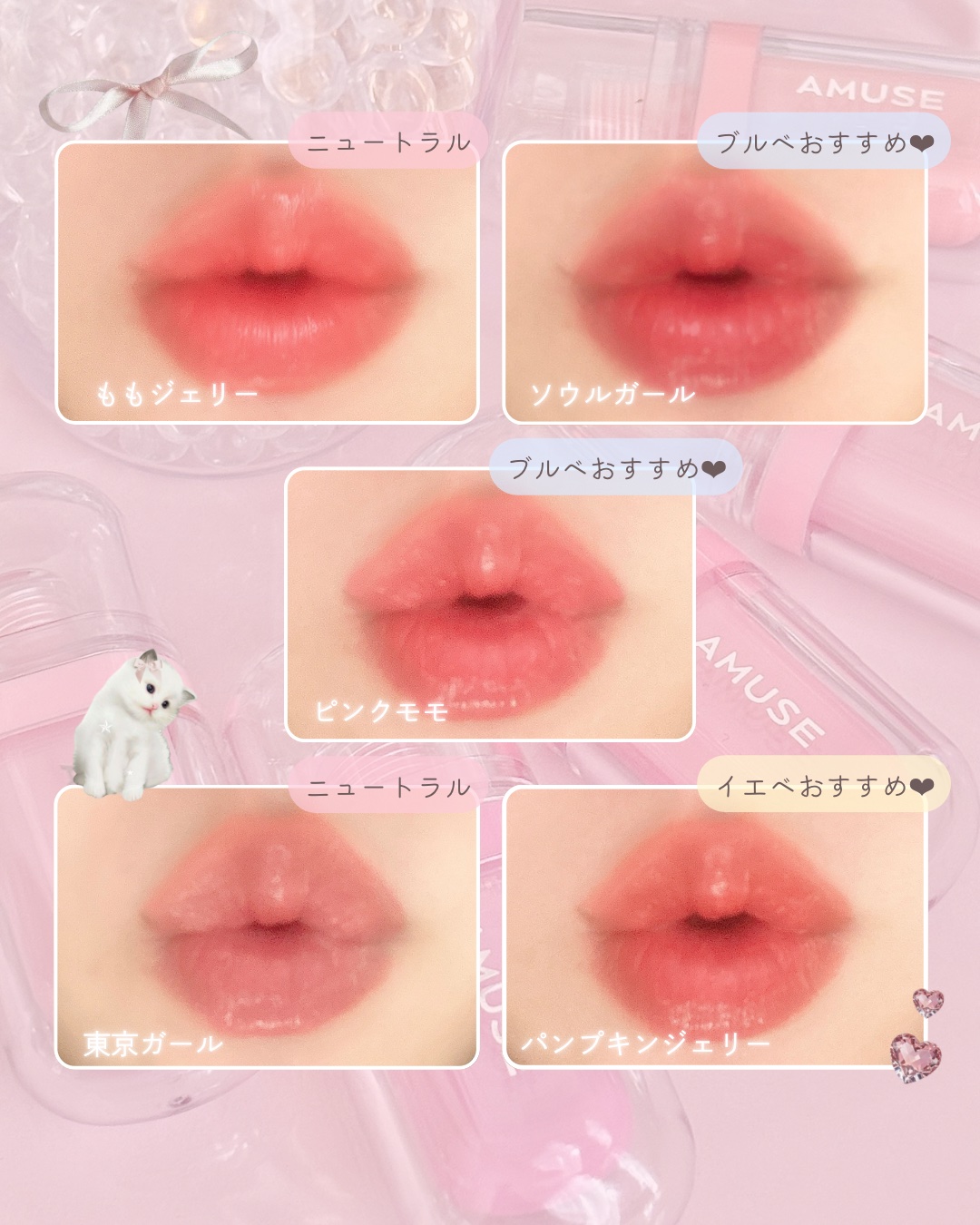 - 濃密なぷにゅっとジェリーが もっちり密着される 長時間持続のジェルフィットティント ☑ぷにゅっとジェリーがもっちり密着される長時間持続&新概念ジェルフィットテクスチャー* ☑8Shadesの透き通るぷにゅっとジェリー発色 ☑3重ツヤシステムで満たせれたぷにゅっとしたジェリーツヤ ☑ジェリーツヤ膜で保湿感ロック ☑手軽いサイズのNEW透明ティント&ぷにゅぷにゅジェリーデザイン ☑ヴィーガン処方 *)AMUSE内において